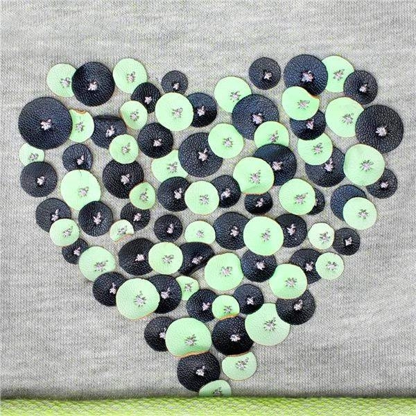 - Design: aplikace srdíčka, šedo‑zelené provedení