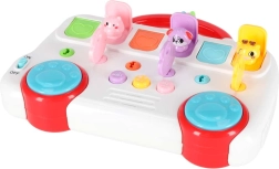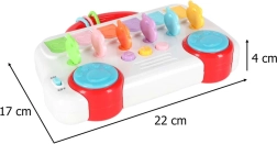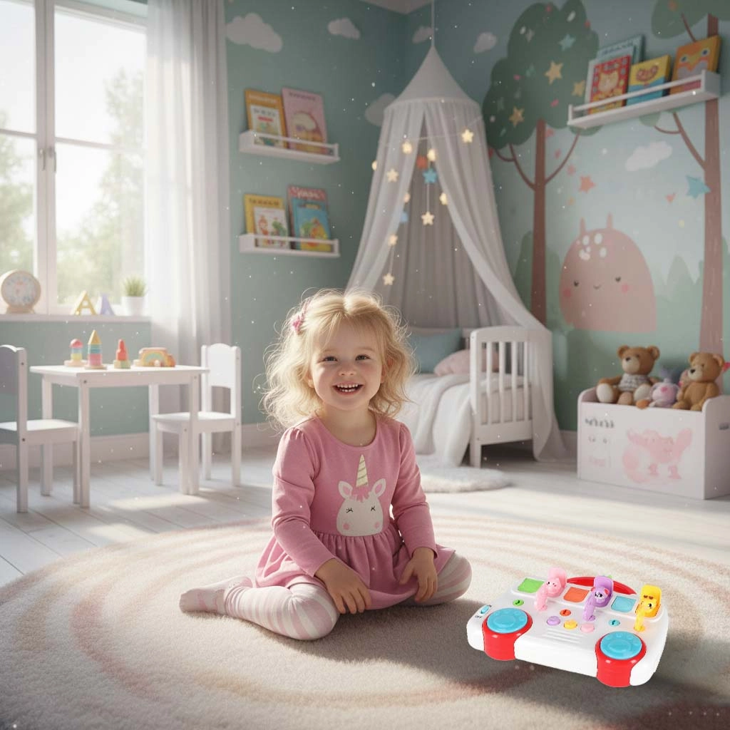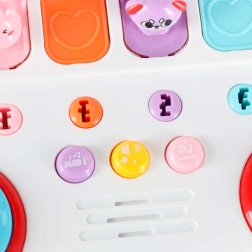 Na panelu najdete hudební tlačítka s melodiemi, tlačítko hlasitosti se 3 úrovněmi a modré „tlapkové“ spínače s perkusními zvuky. Díky pestrým efektům a snadnému ovládání si děti užijí hodiny kreativní hry doma i na cestách – bezpečně a s úsměvem.