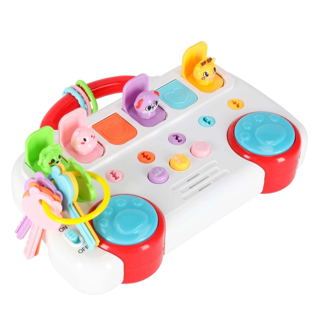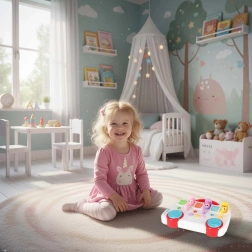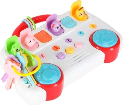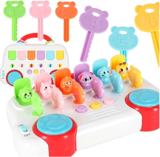 Hudební edukační autobus nadchne děti barevnými klíčky, zábavnými zvuky a roztomilými zvířátky. Každé ze šesti zvířátek je ukryto za dvířky – stačí přiřadit klíček podle čísla a barvy a po otočení zvířátko vyskočí. Hračka tak přirozeně rozvíjí logiku, koordinaci ruka-oko a poznávání čísel a barev.