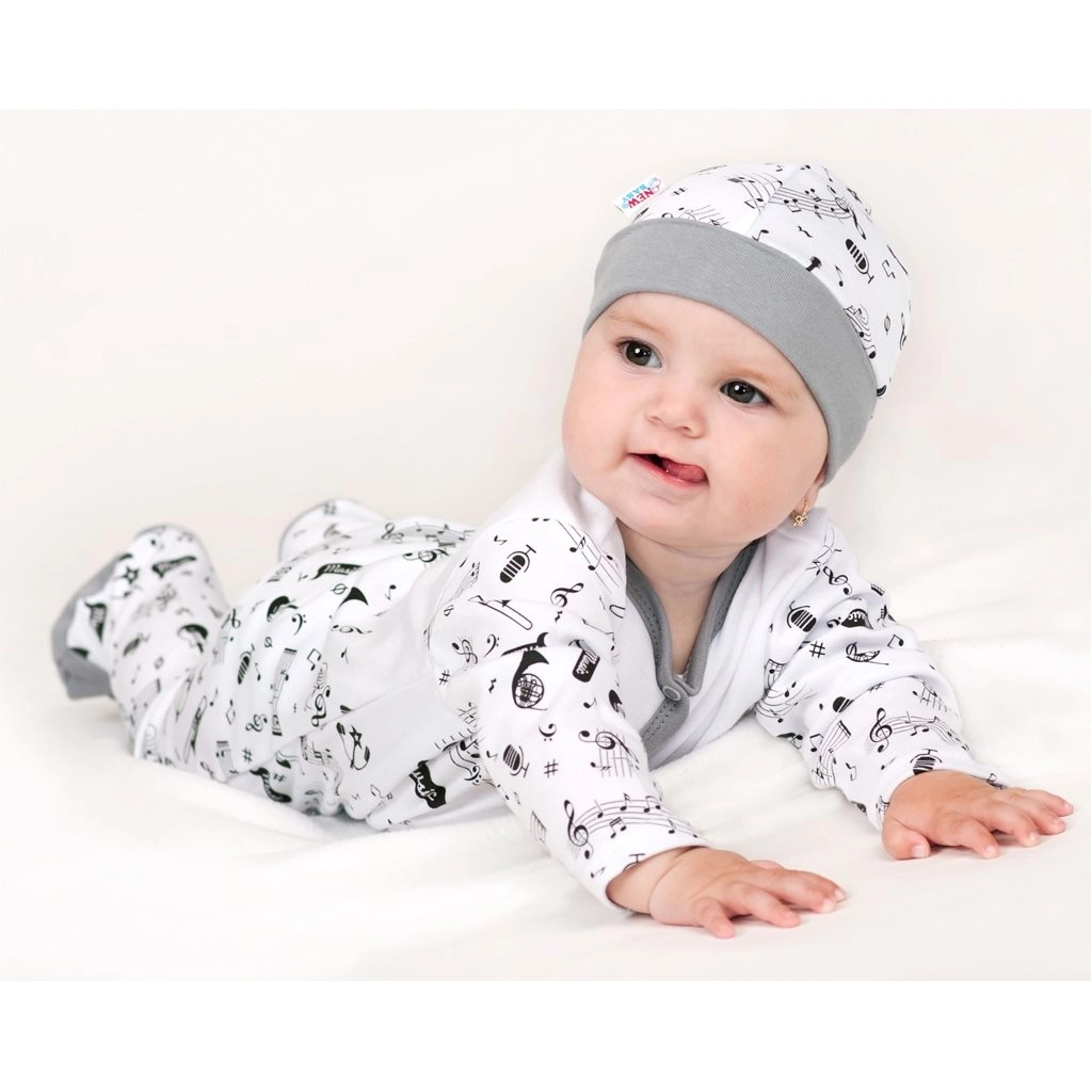 Pohodlné bavlněné polodupačky New Baby Music z příjemného materiálu pro každodenní nošení. Mají široký neškrtící pas, praktické zapínání na cvočky mezi nožičkami a hravý motiv not a hudebních nástrojů. Vhodné pro chlapce i dívky.