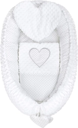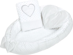 Díky praktické stahovací šňůrce snadno upravíte vnitřní prostor – od pevnějšího objetí po volnější ležení. Hnízdečko skvěle poslouží v postýlce, kočárku, na pohovce i na zemi, kde dítěti poskytne měkké a bezpečné zázemí. Set doplňuje srdíčkový polštářek a peřinka pro ještě větší pohodlí.