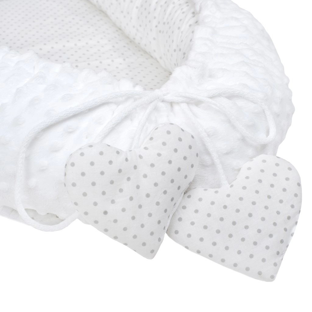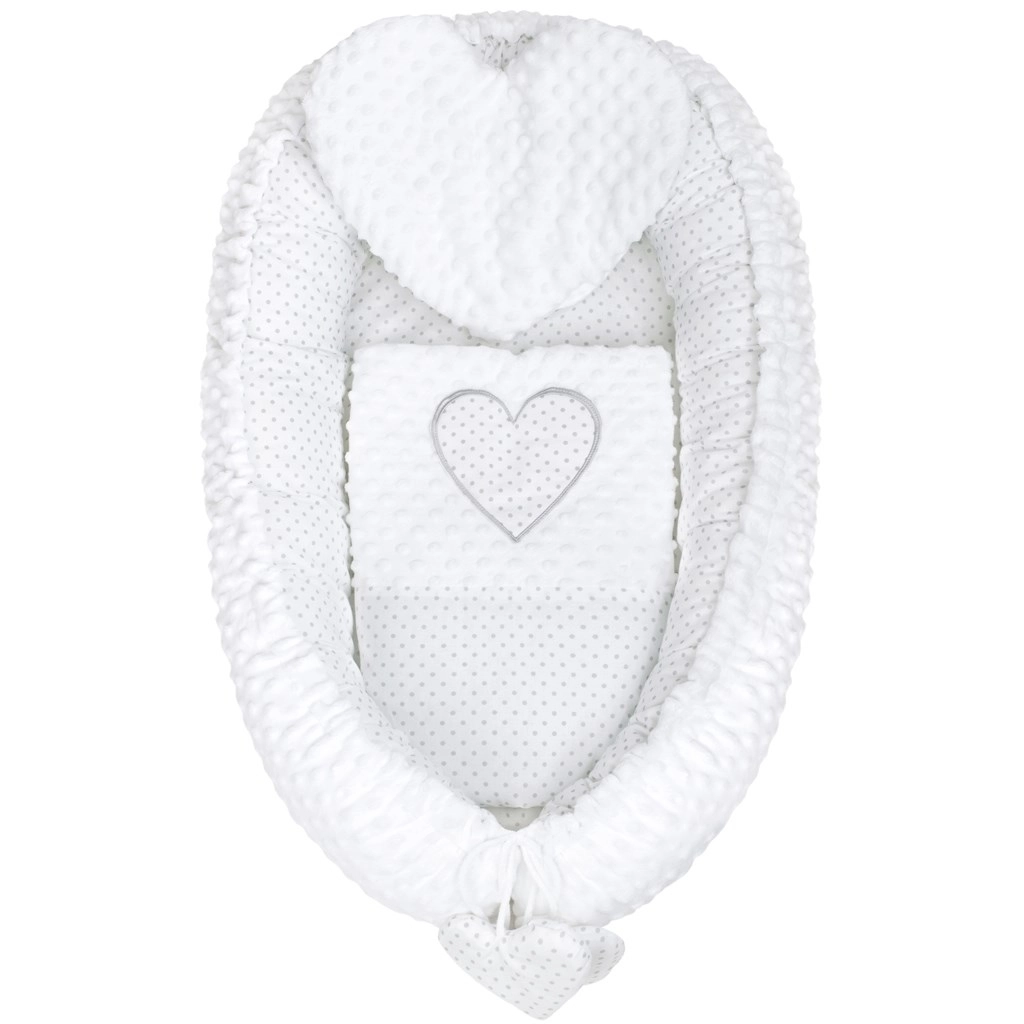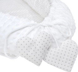 Hnízdečko New Baby Minky Srdíčko bylo navrženo pro klidný spánek a pohodlné odpočívání novorozenců. Obojstranné provedení umožňuje využít jak heboučkou Minky stranu s vystouplými body pro jemnou senzomotorickou stimulaci, tak bavlněnou stranu pro přirozenou prodyšnost a šetrnost k citlivé pokožce.