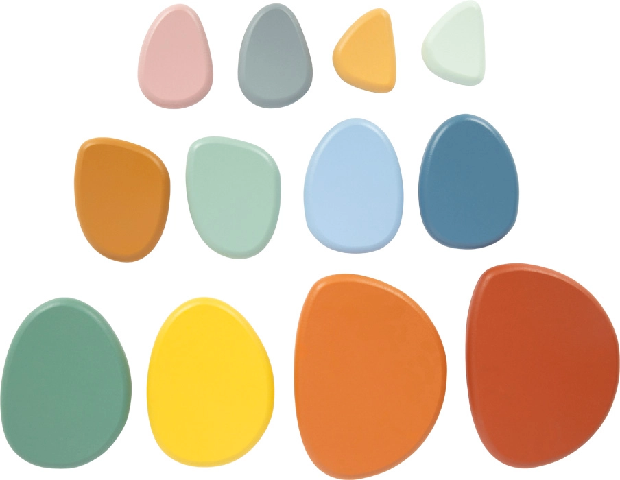 Tato nadčasová sada dvanácti „říčních“ kamenů je inspirována Montessori pedagogikou a vybízí děti k klidné, soustředěné a tvořivé hře. Nepravidelné tvary, hladký povrch a pastelové tóny lákají ke stavění, balancování, třídění podle velikosti a barev i prvnímu počítání. Při hře si děti nenásilně rozvíjejí jemnou motoriku, koordinaci oko–ruka a trpělivost.