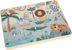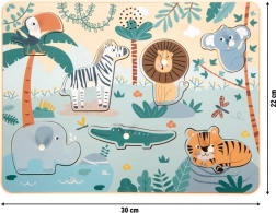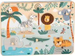 Dřevěné vkládací puzzle se zvukem promění první učení v dobrodružství. Děti umisťují lev, tygr, slon, zebra, koala, tukan a krokodýl na správná místa a při zvednutí dílku uslyší autentický zvuk zvířete. Kvalitní zpracování z FSC® certifikovaného dřeva je příjemné na dotek a šetrné k přírodě.