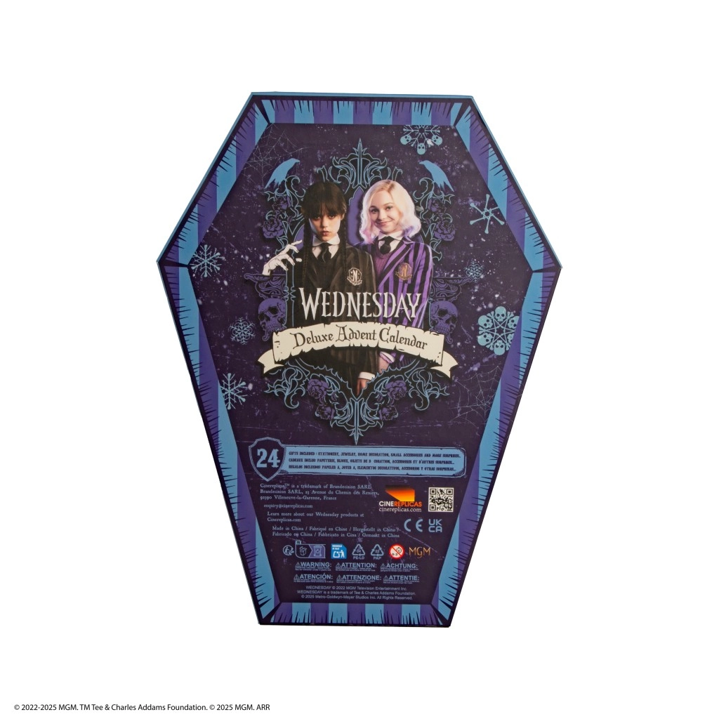Tento exkluzivní adventní kalendář ve tvaru rakve potěší každého fanouška WEDNESDAY. Uvnitř najdete pečlivě navržené přihrádky s 24 tematickými překvapeními, které spojují zábavu, praktičnost a sběratelskou hodnotu. Díky poutavému designu je kalendář ideální i jako dekorativní dárek na svátky.