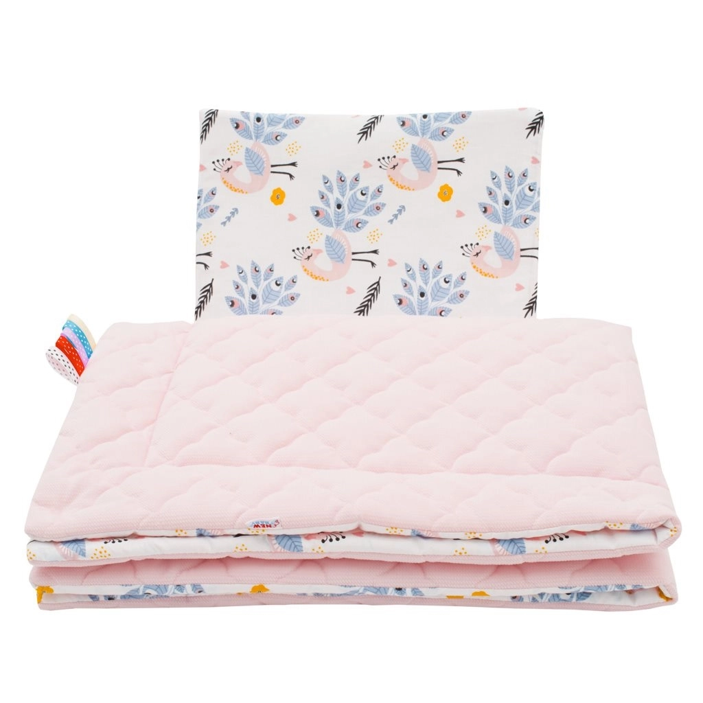 - Růžové provedení s motivem pávů, stužky na přikrývce