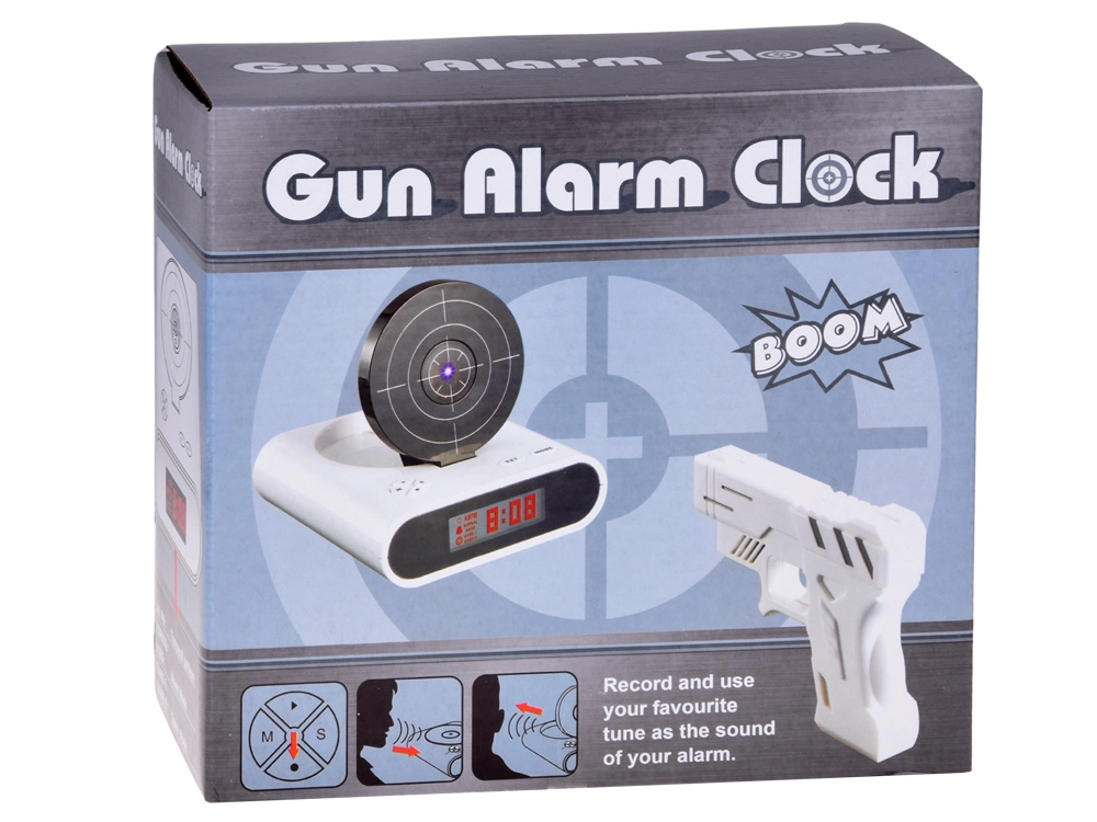 Zpříjemněte si ranní vstávání s originálním budíkem, který umlčíte zamířením na terč a stiskem spouště. Tento zábavný budík nabízí střelbu na terč pomocí infračervené pistole, možnost nahrát vlastní zvuk alarmu a 2 herní režimy. Díky čitelnému LCD displeji a napájení bateriemi nebo micro USB je ideální do ložnice, kanceláře i jako netradiční dárek.