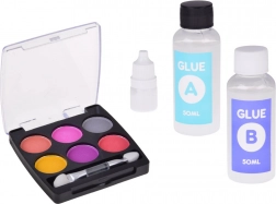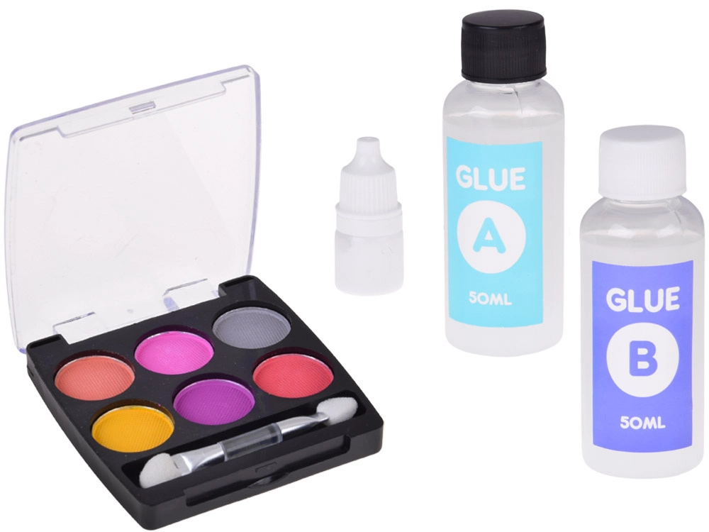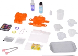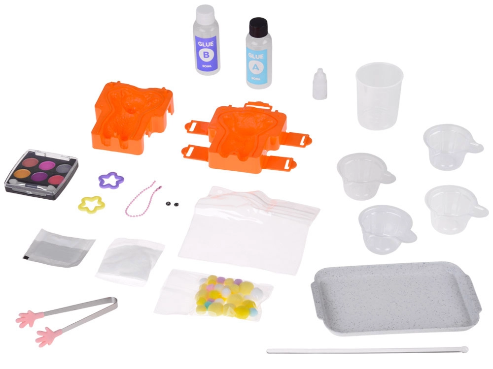 Součástí sady je forma, kleště, míchátko, odměrka, 2× lepidlo, pigment, dekorace, rukavice i praktická mistička a tácek pro čisté tvoření. Jednoduchý návod provede děti krok za krokem – od smíchání hmoty až po finální zdobení a zavěšení.