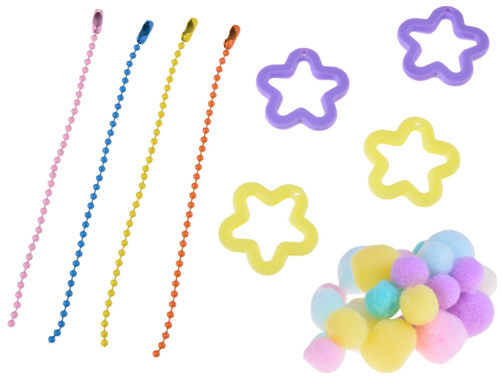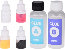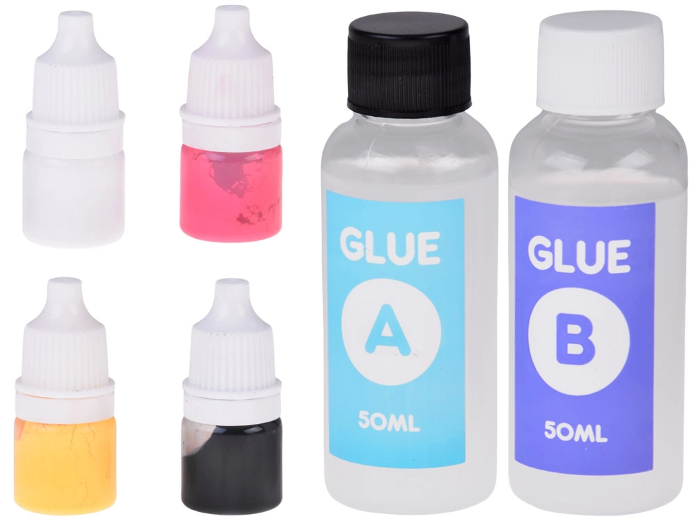 - Forma na 4 slizy, míchací špachtle, plastový nožík, 2× lepidlo (A+B), odměrka, 4× barvivo, měkké ozdobné kuličky, ochranné rukavice, 4× hvězdička, 4× průhledný kelímek, 4× ozdobný sáček, 4× řetízek na klíčenku, tácek