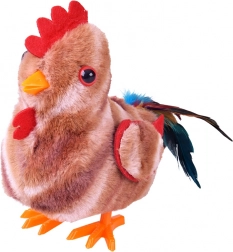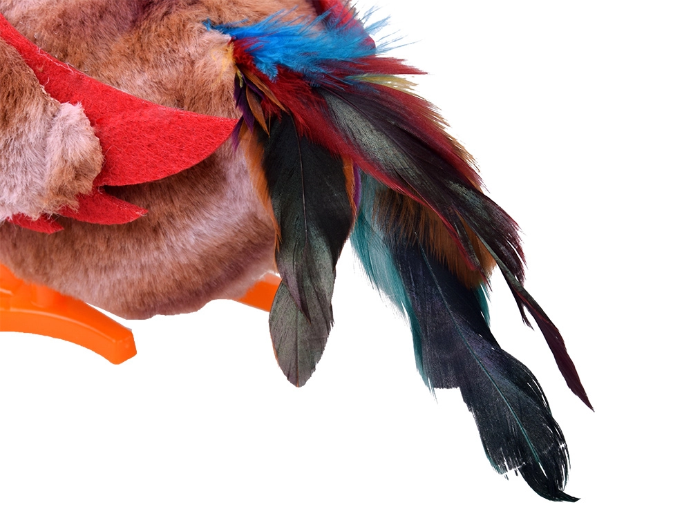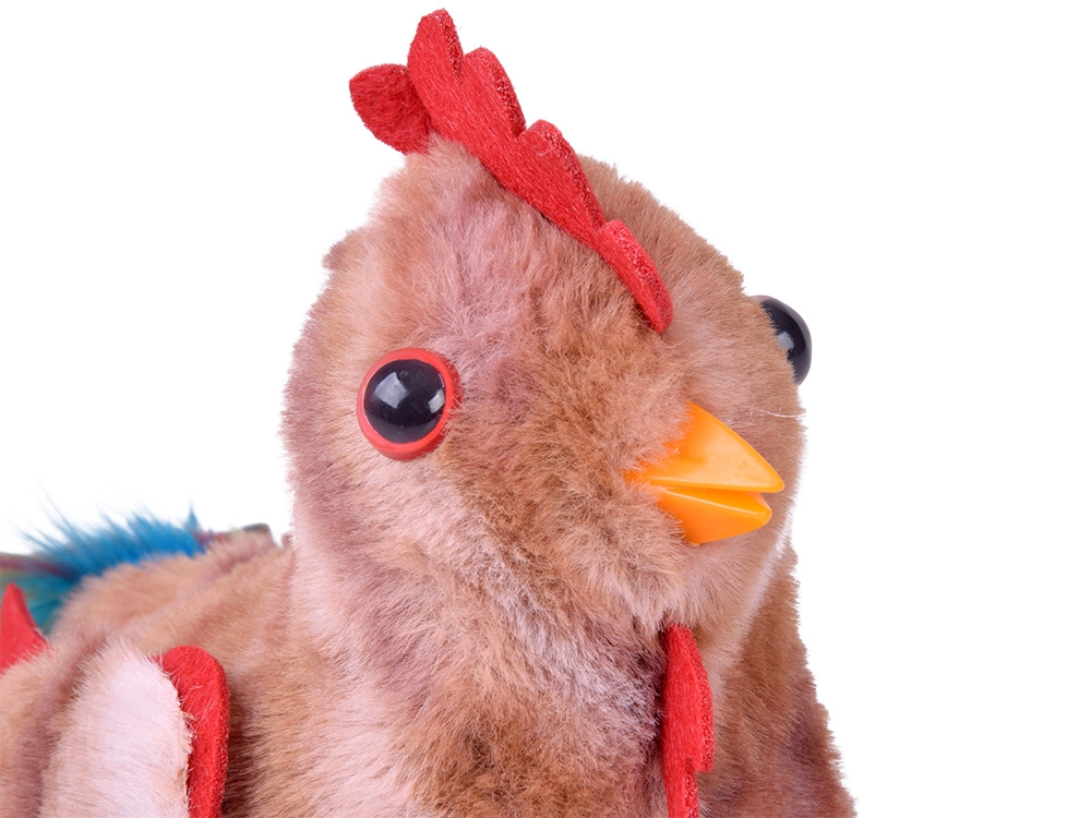 Příjemný plyš, červený hřebínek a pestrobarevný ocas potěší na dotek i na pohled – vhodné pro mazlení i dekoraci.