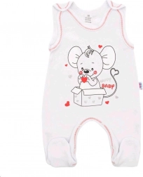 Materiál ze 100% bavlny je měkký, prodyšný a šetrný k citlivé pokožce, takže je vhodný pro každodenní nošení. Díky zapínání na cvočky na ramínku a mezi nožičkami je přebalování i oblékání otázkou chvilky.