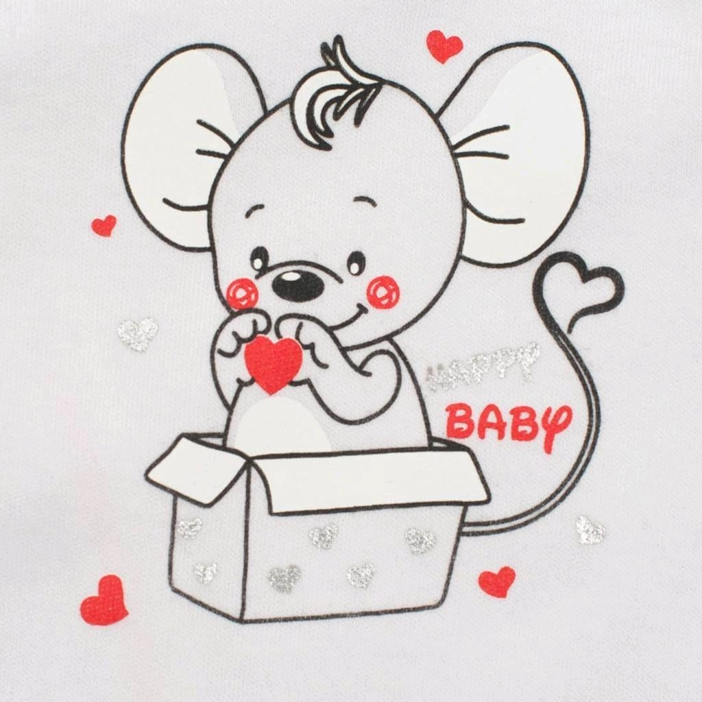 Tato souprava pro miminka kombinuje jemnost, praktičnost a roztomilý design. Jednobarevný kabátek se zapínáním na cvočky po celé délce se snadno obléká i svléká. Dupačky zdobí kontrastní lemování a velký potisk myšky, který dodá outfitu hravý vzhled.