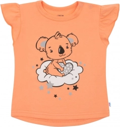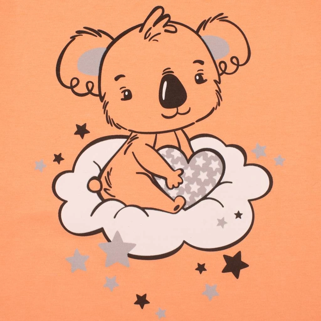 Roztomilé dvoudílné dětské pyžamo New Baby Dream v lososové barvě přináší měkkou 100% bavlnu, pohodlný střih a elastický pas, který netlačí na bříško. Tričko s krátkým rukávem zdobí volánky a milý motiv koaly na obláčku, kraťasy mají celoplošný potisk a jemné volánky u nohaviček. Ideální na léto i jako pohodlné domácí oblečení.