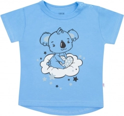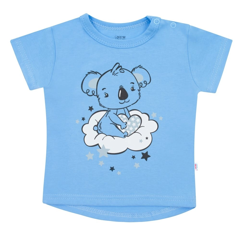 Roztomilé dětské letní pyžamo New Baby Dream v modré barvě z příjemné 100% bavlny. Set tvoří tričko s krátkým rukávem a kraťasy. Triko zdobí roztomilý motiv medvídka na obláčku a hvězdičky, má praktické zapínání na rameni na cvočky pro snadné oblékání. Kraťasy jsou celopotiskem s medvídky a mají širší elastický pas, který je pohodlný a netlačí na bříško. Ideální jako letní pyžamko i pohodlné domácí oblečení pro miminko.