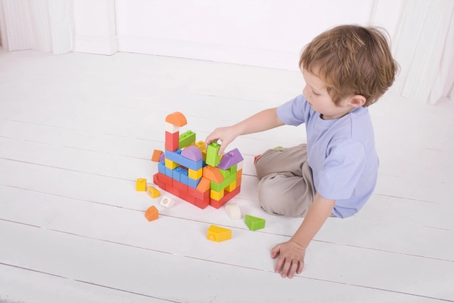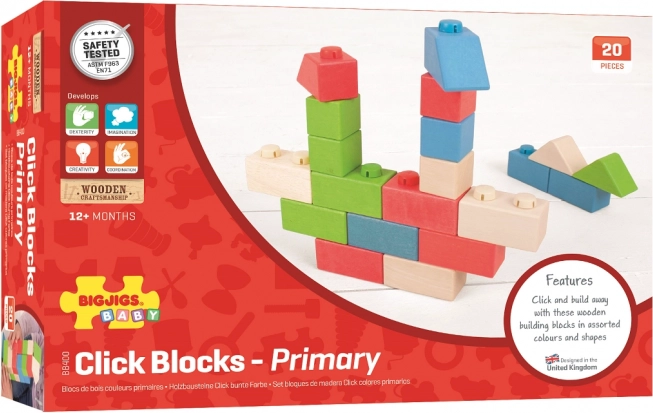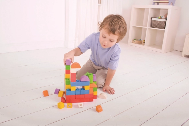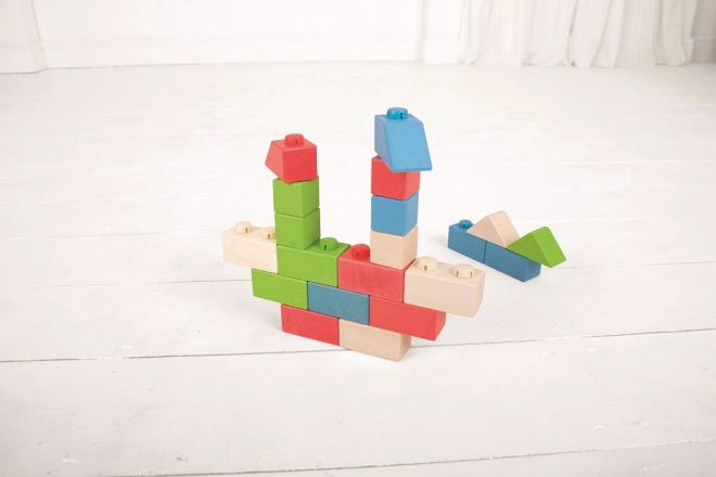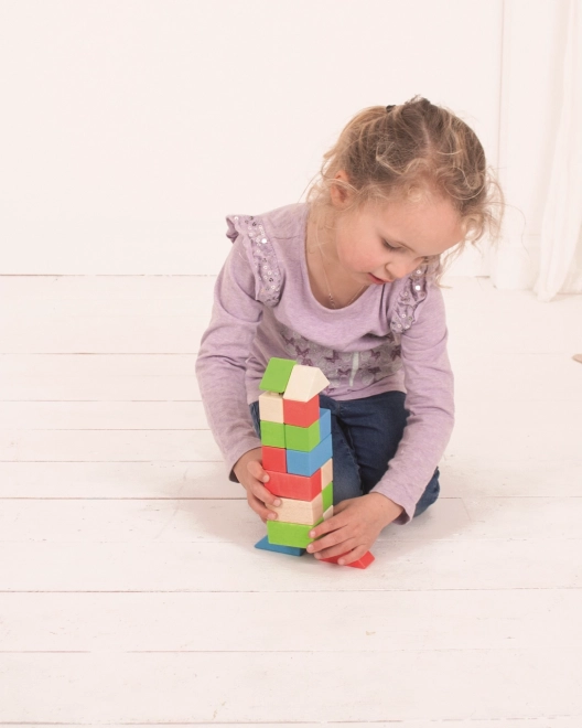 Dřevěná stavebnice Bigjigs Baby nabízí unikátní kombinaci dřevěných kostek a plastových spojek, které umožňují pevné a stabilní stavby. Kostky v různých tvarech a barvách jsou ideální pro dětské ručičky.