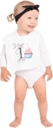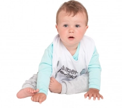 Potisk s vtipným nápisem máma + táta = já je vyroben z certifikovaných barev vhodných pro miminka. Praktické zapínání na cvoček usnadňuje rychlé nasazení i sundání a bílé lemování dodává bryndáku čistý vzhled.