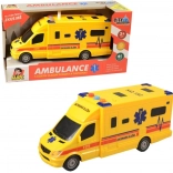 Realistická dětská sanitka na setrvačník se světelnými efekty, zvukem majáku a hlasovými hláškami dispečinku a posádky. Plastové provedení, velikost cca 19 cm, ideální pro kluky i holky od 3 let.