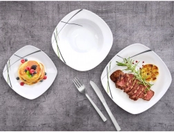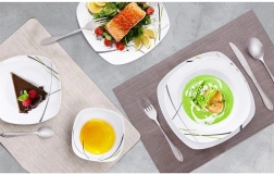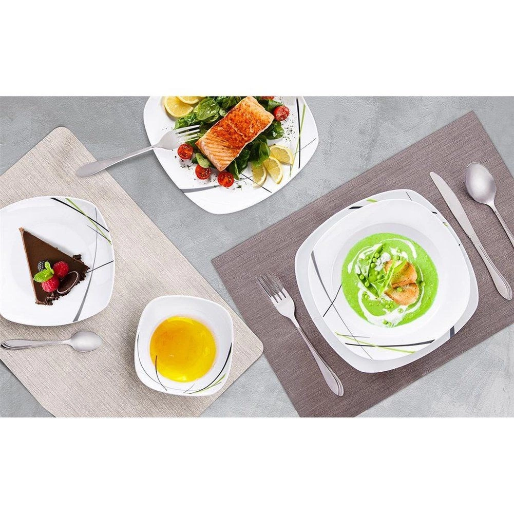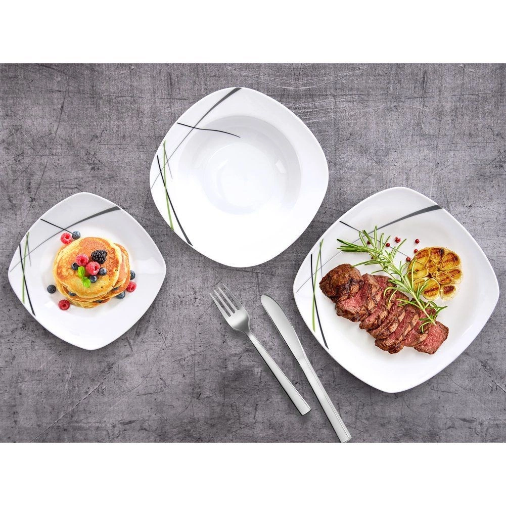 Tato čtvercová jídelní souprava z kvalitního porcelánu přináší styl i praktičnost do každé domácnosti. Moderní dekor v kombinaci zelené, černé a šedé barvy krásně vynikne na stole a snadno ji sladíte s další výbavou. Je ideální pro snídaně, obědy i večeře a skvěle poslouží při rodinných setkáních i slavnostních hostinách.