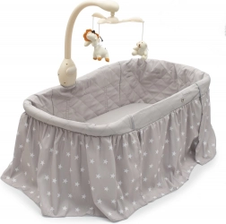 Součástí je kolotoč s barevnými zvířátky vybavený nočním světlem, hudebním modulem s 8 melodiemi a jemnými vibracemi – vše s plynulou regulací intenzity i hlasitosti. Praktický spodní koš udrží všechny nezbytnosti po ruce a zpevněná vnitřní podšívka s vinylovou matrací zajistí hygienu i snadnou údržbu.