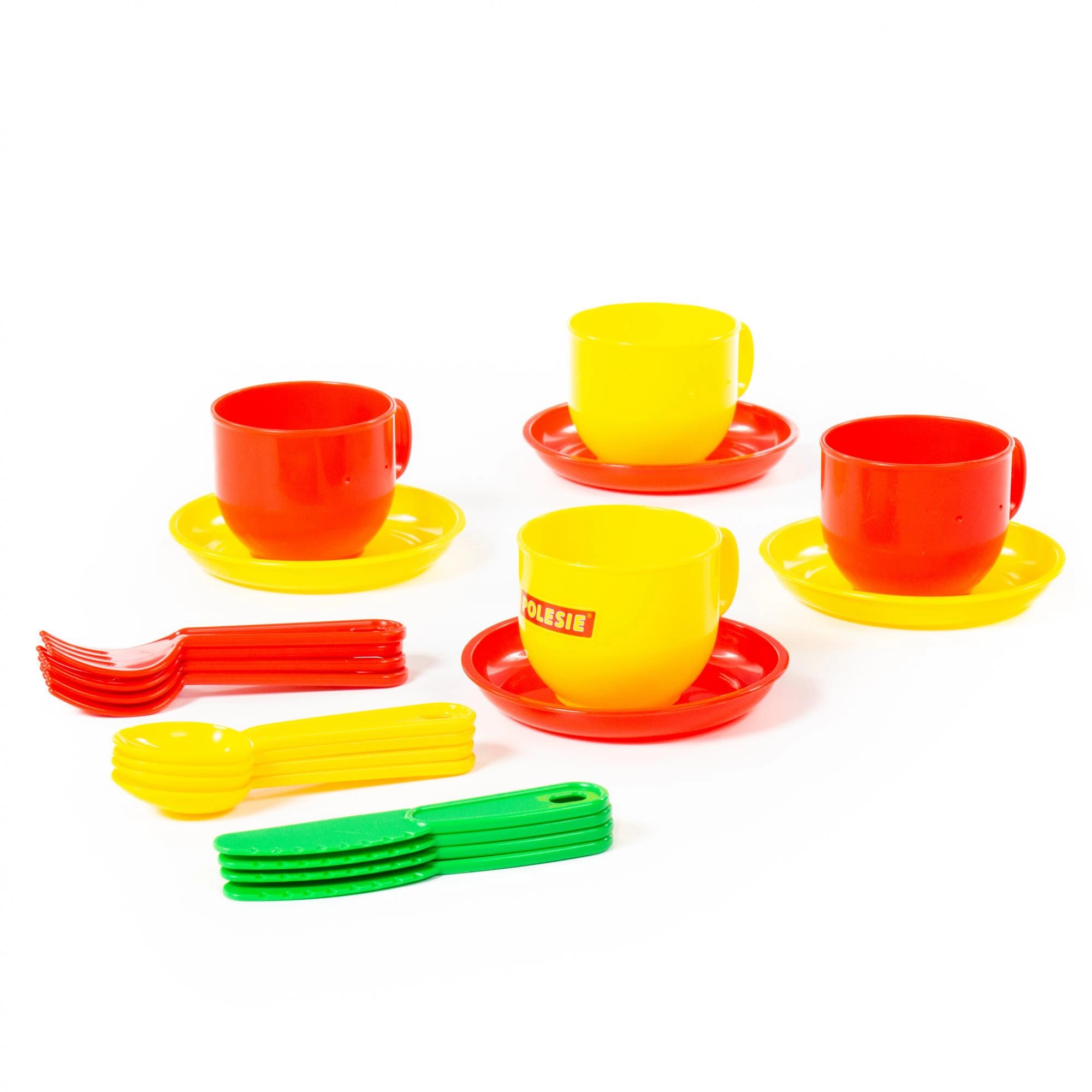 Barevná dětská jídelní sada pro 4 osoby obsahuje tácek, 4 talířky a 4 šálky s kompletním příborem. Ideální pro hraní na čajový dýchánek a servírování. Díky lehkým a odolným plastům je sada bezpečná a snadno se udržuje. Lehká, odolná a snadno omyvatelná dětská sada podporuje role-play, jemnou motoriku i společenskou hru.