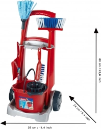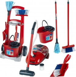 - Kompletní výbava: vozík, kbelík s vytlačovačem, mop, smeták, smetáček s lopatkou a hračkový vysavač s granulátem.