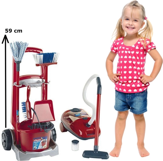 Set je navržen tak, aby děti mohly bezpečně napodobovat každodenní úklid. Robustní vozík v červeno-šedém provedení s velkými koly se snadno ovládá a převeze všechna příslušenství na své místo. Hračkový vysavač v červené barvě má průhlednou nádobku a během hry nasává přiložený granulát, který lze po naplnění jednoduše vysypat – o to realističtější je i zvuk vysávání.