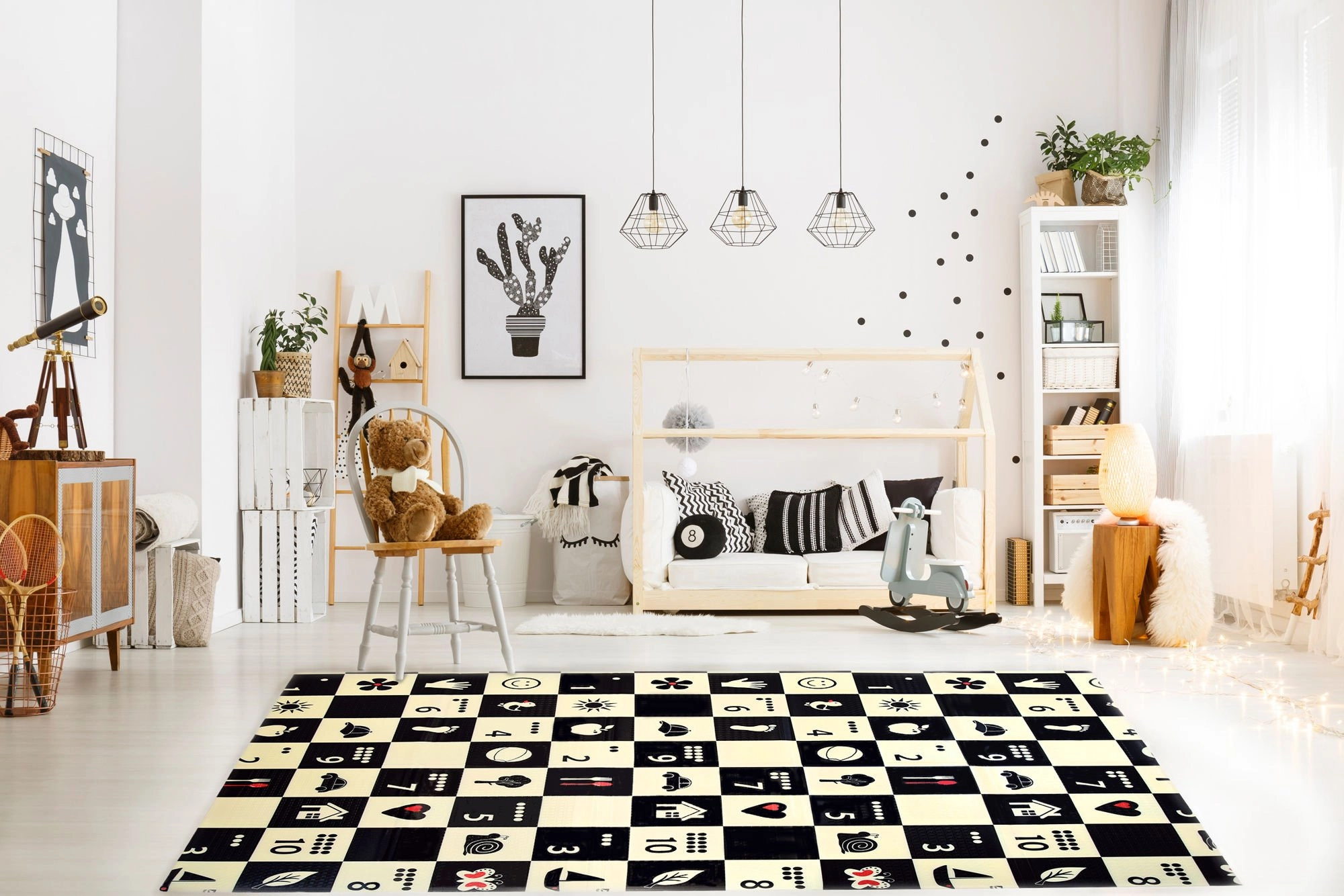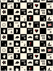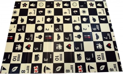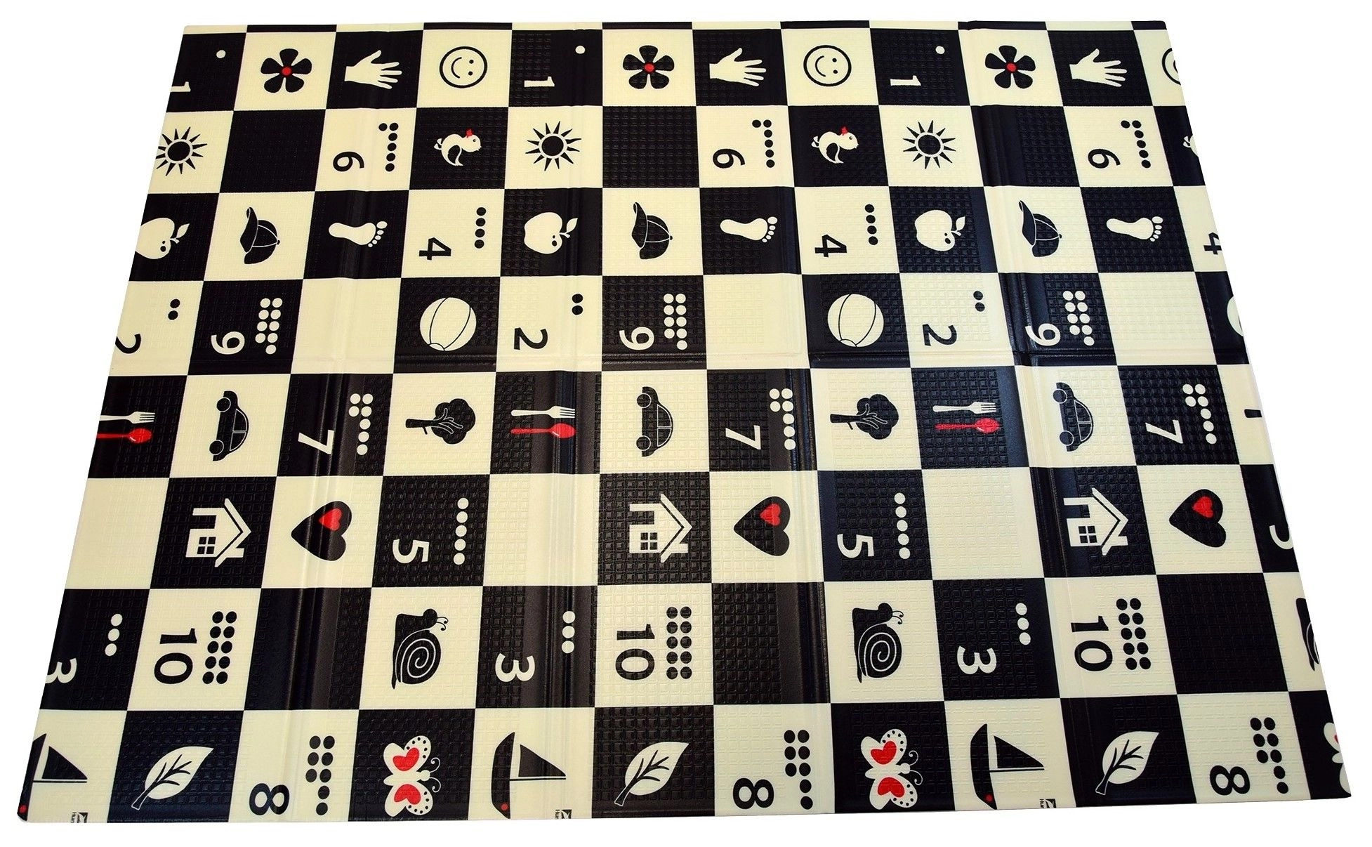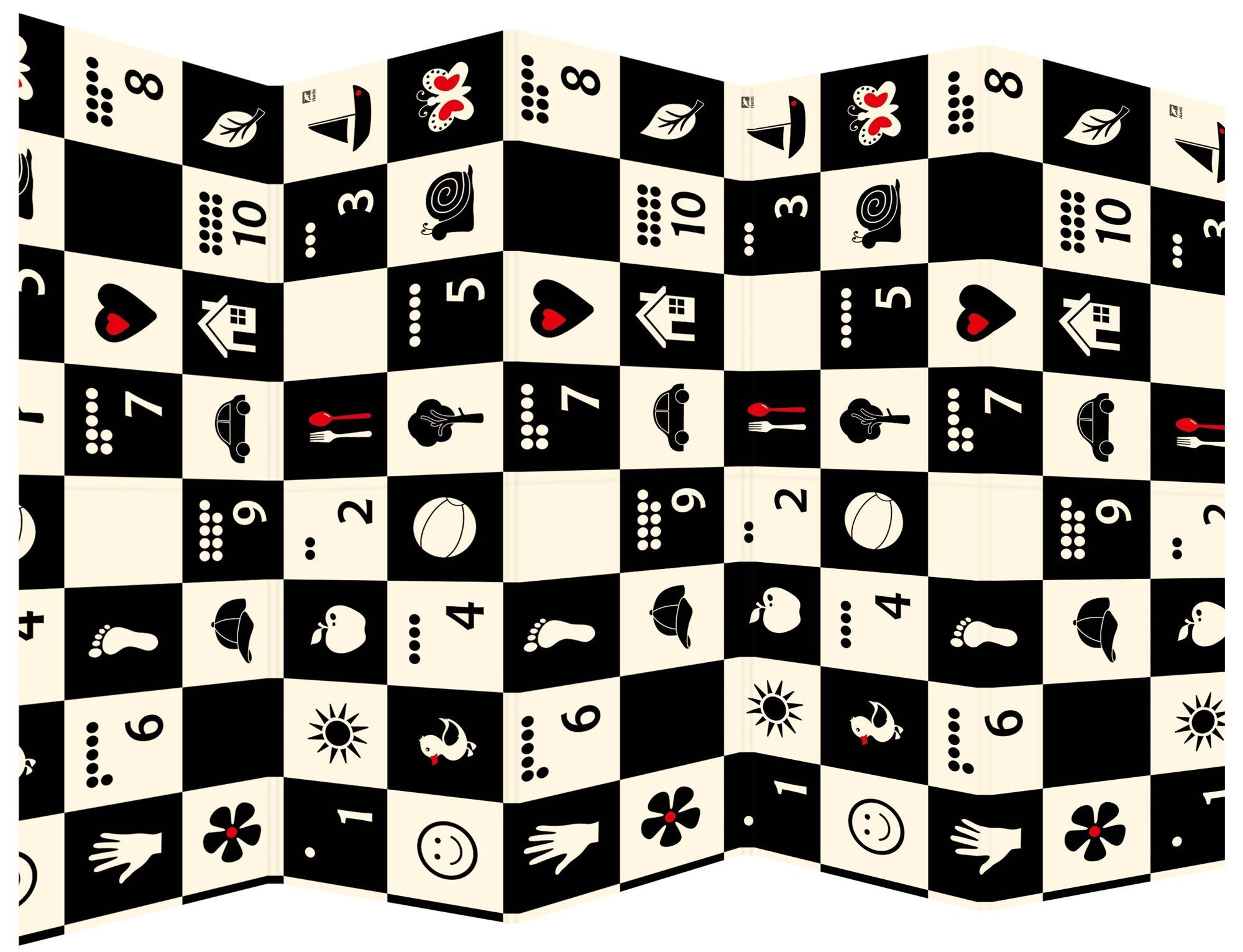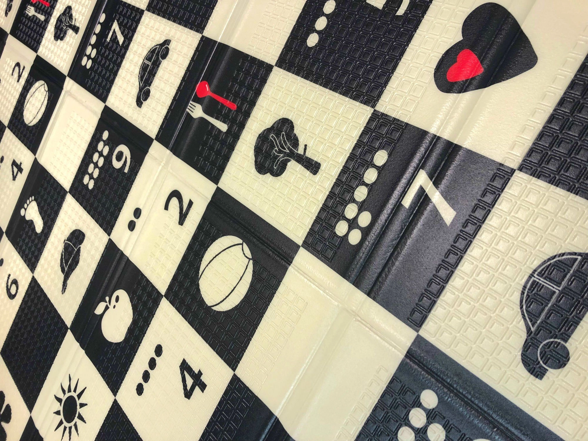Černobílá šachovnice s jednoduchými ikonami stimuluje zrak, podporuje vizuálně-prostorovou inteligenci a přitahuje pozornost miminek.