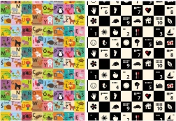 - Kontrastní čísla a symboly; barevná abeceda se zvířaty