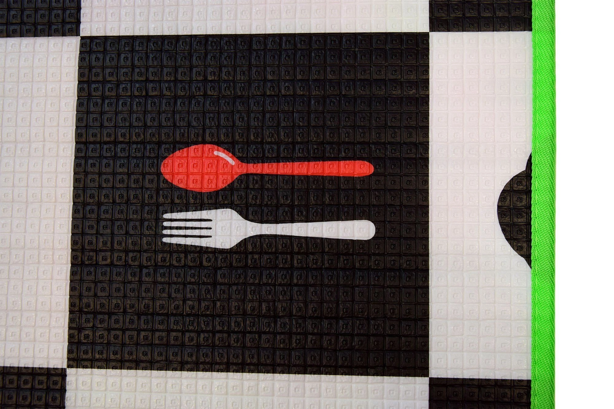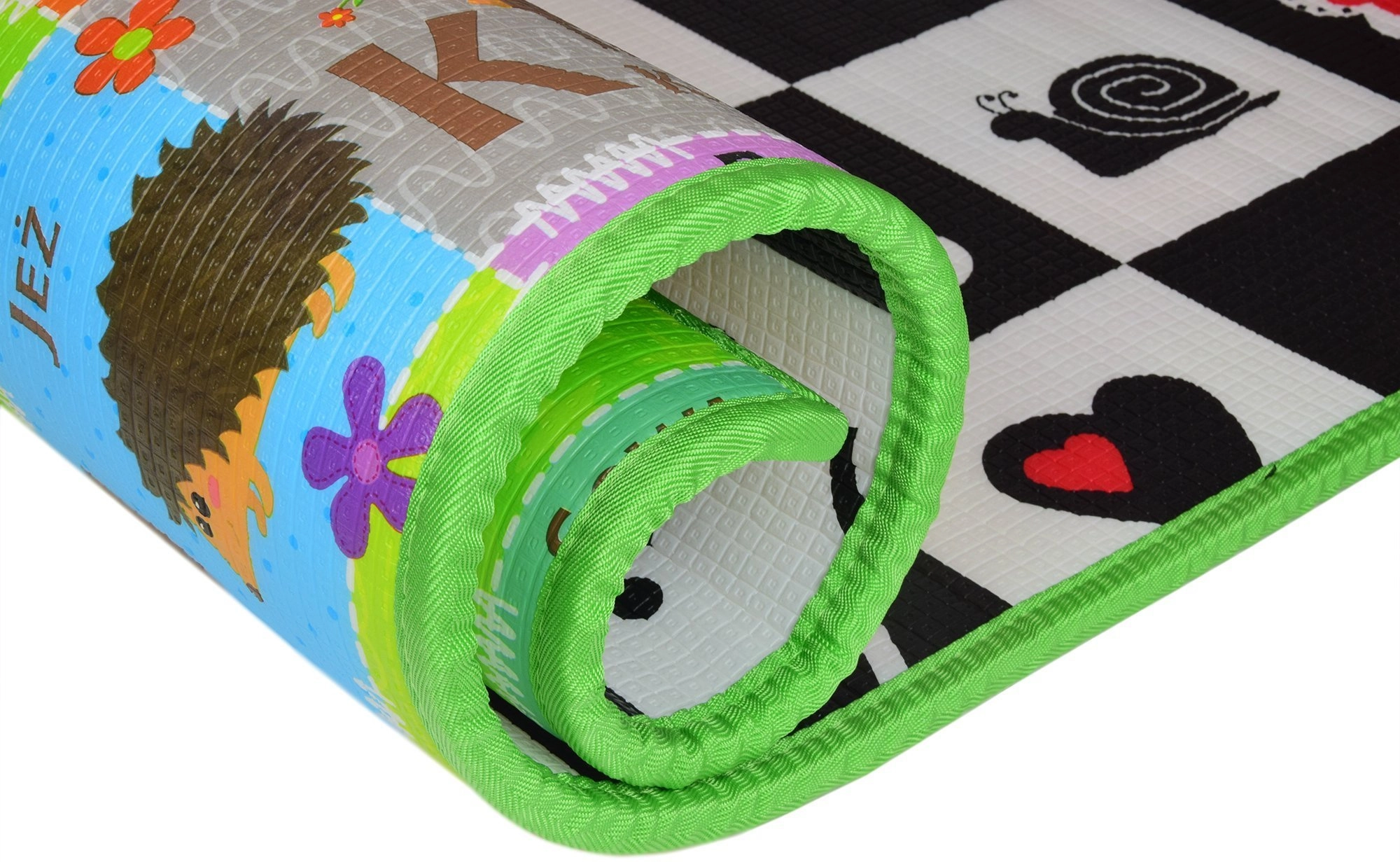 Podložka je vyrobena z bezpečné, netoxické a bez zápachu EPE pěny, neobsahuje formamid, ftaláty, PVC ani BPA a splňuje EN71-1, EN71-2, EN71-3 a REACH. Je voděodolná, snadná na údržbu a díky povrchu s jemným reliéfem také protiskluzová. Rychlé rolování usnadňuje přenášení – taška se zipem je v balení.