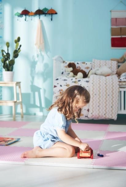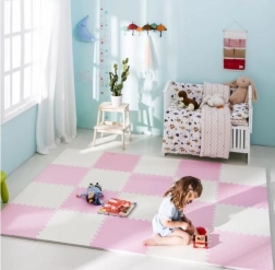 Podložka je voděodolná a snadno omyvatelná – stačí setřít vlhkým hadříkem. Na rozdíl od koberců nepohlcuje prach ani roztoče a je šetrná k citlivé dětské pokožce. Neutrální, jemná růžová barva zapadne do každého interiéru.