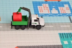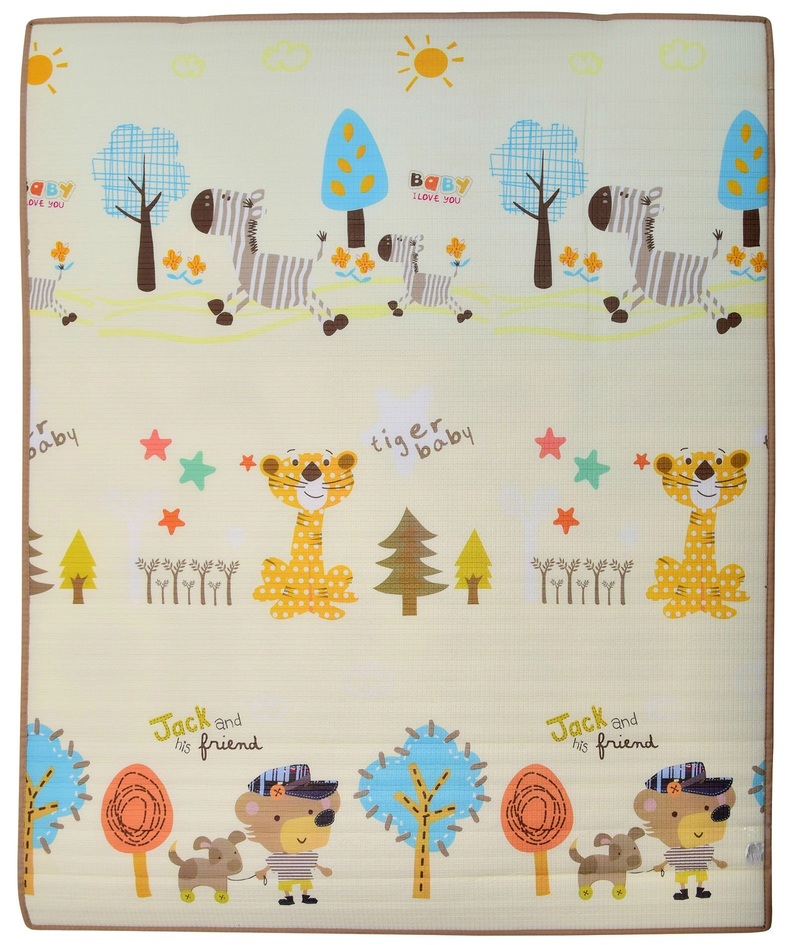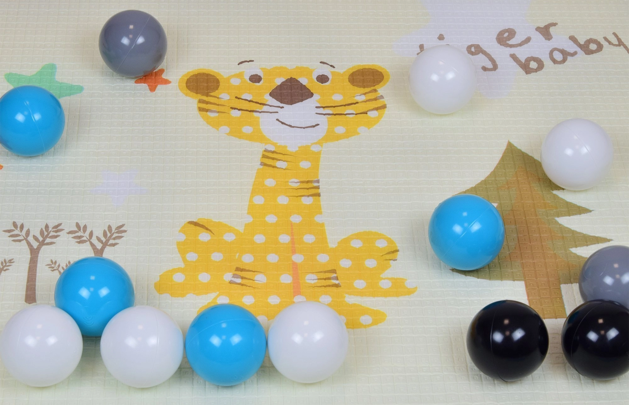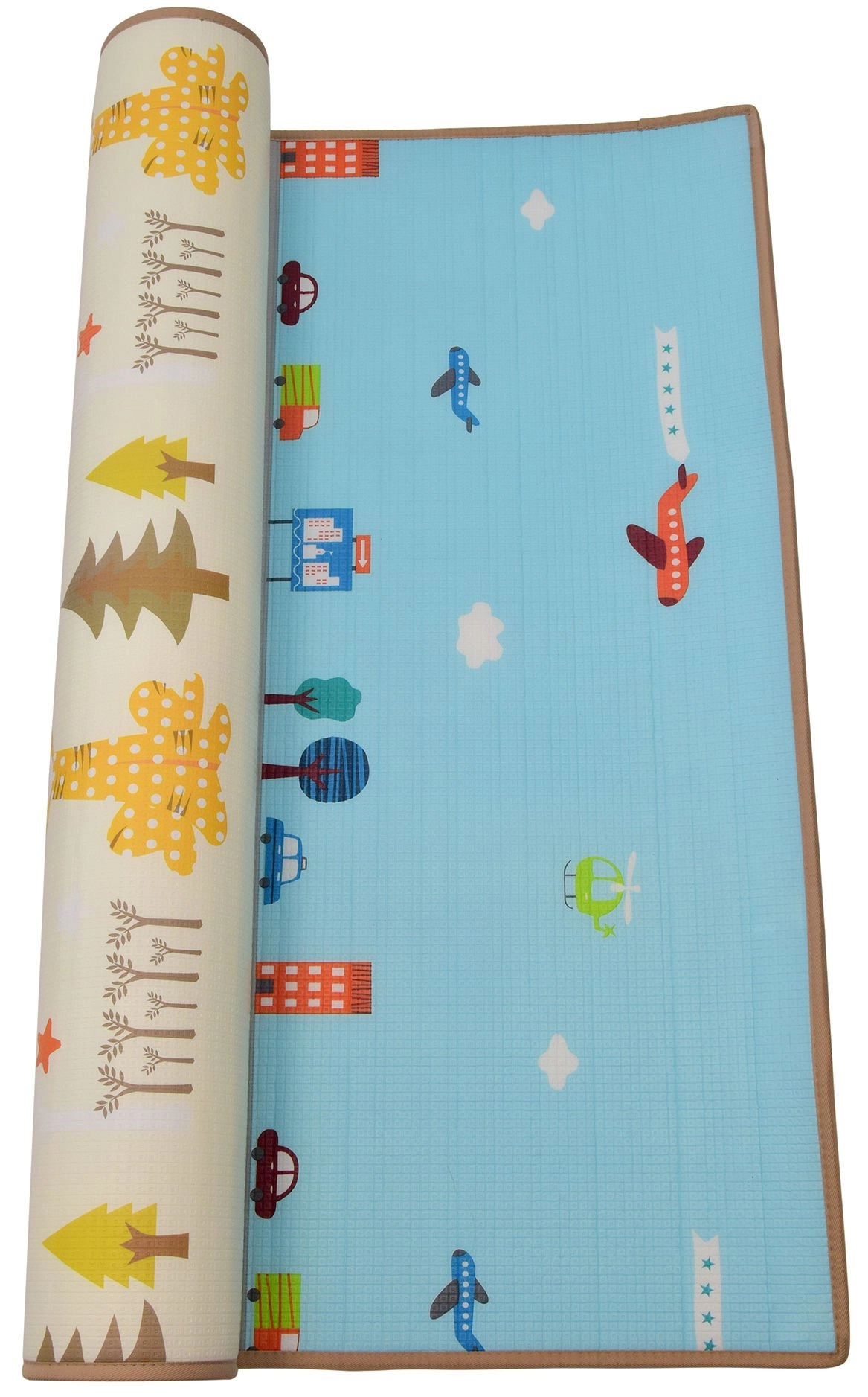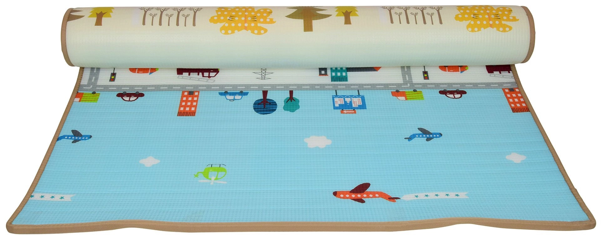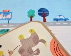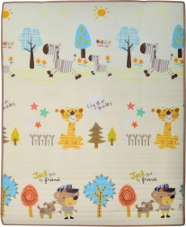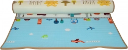 Obě strany zdobí vzdělávací motivy: z jedné strany město s uličkami pro ježdění autíčky, z druhé strany zvířátka na béžovém podkladu. Neobsahuje formamid, ftaláty, PVC ani BPA, splňuje EN71-1/2/3 a požadavky REACH, samozřejmostí je CE.