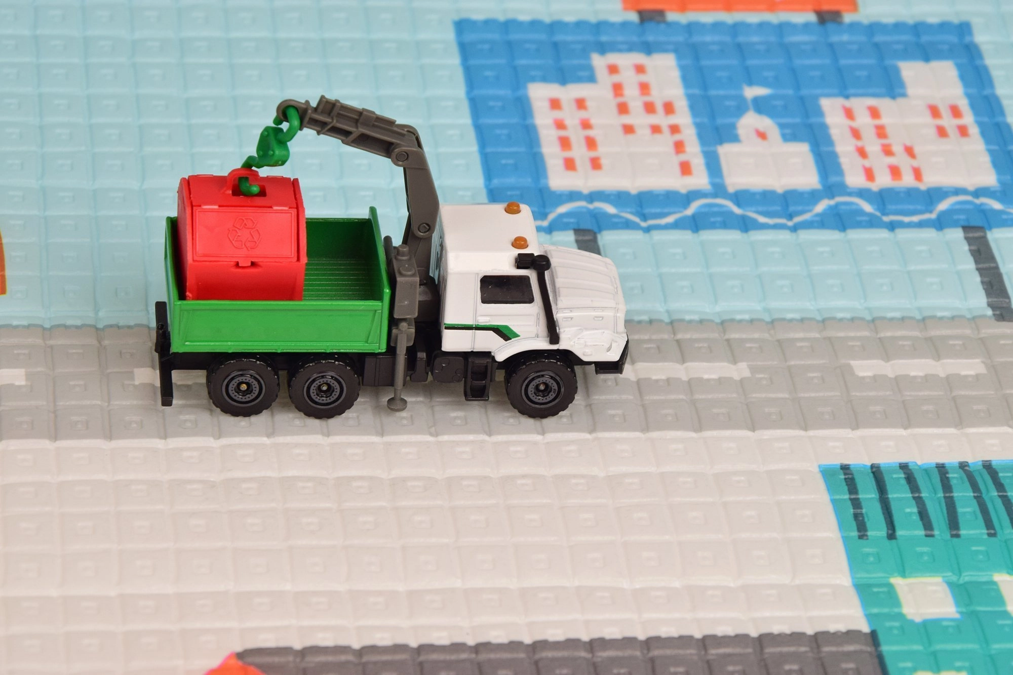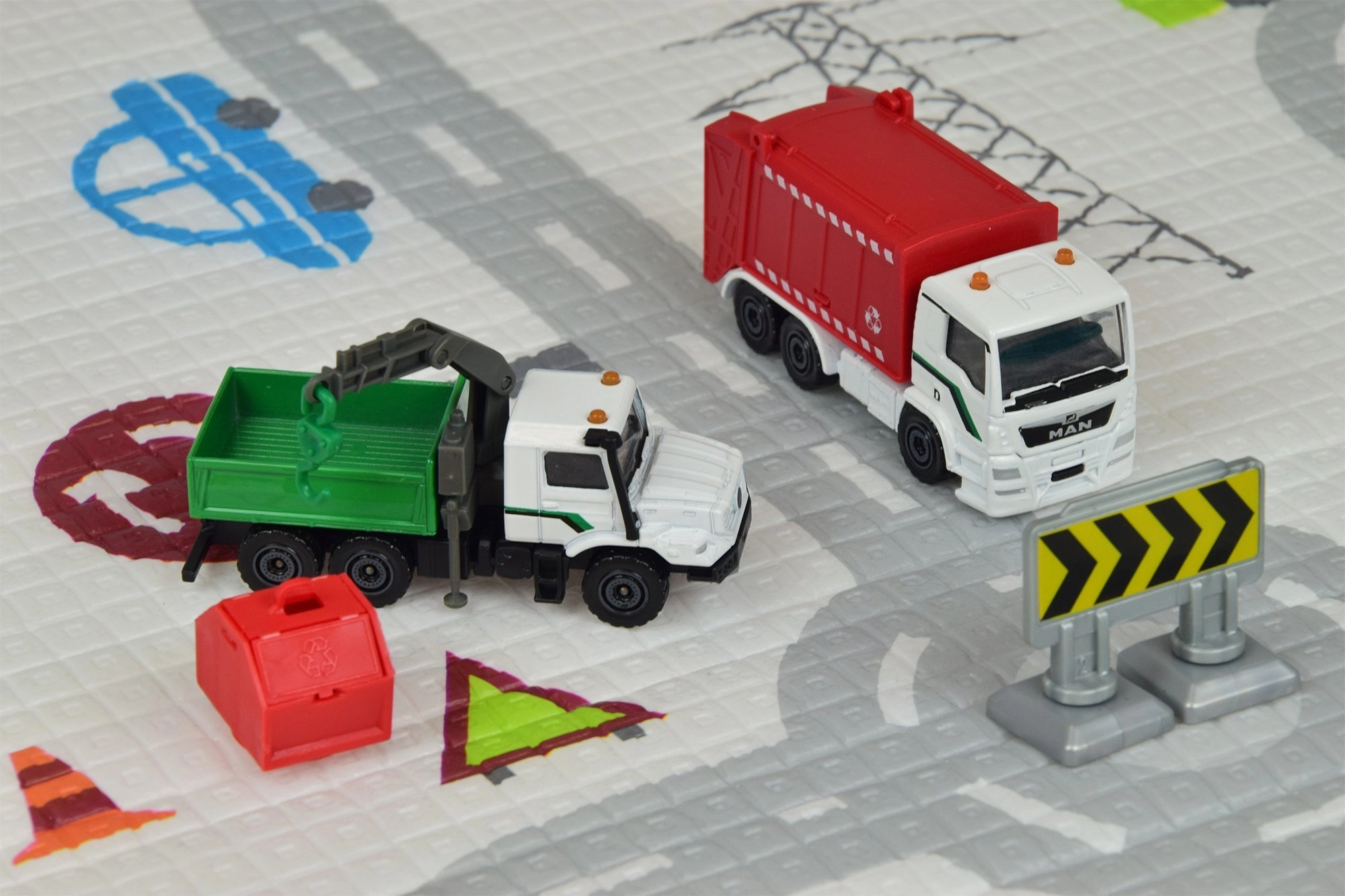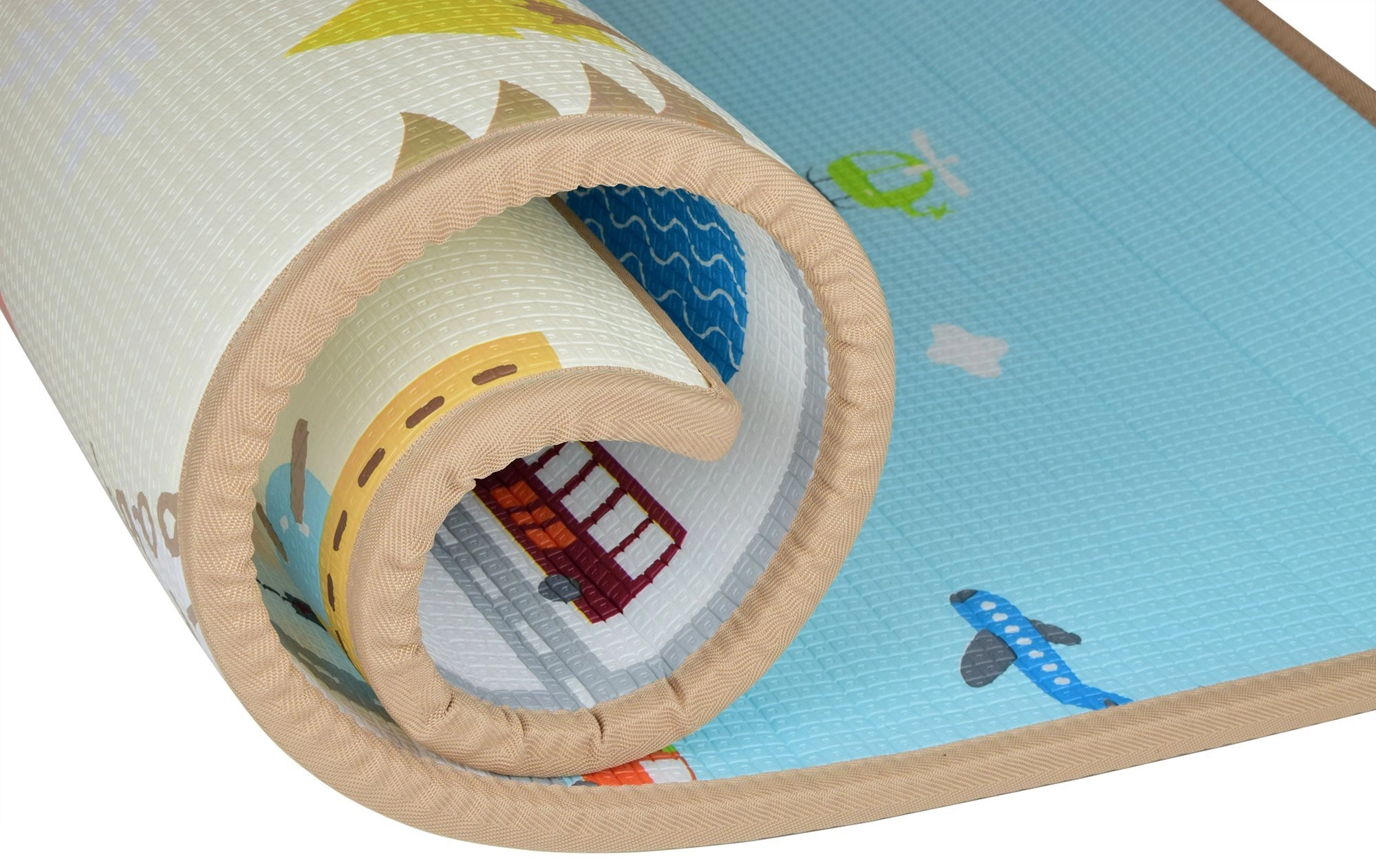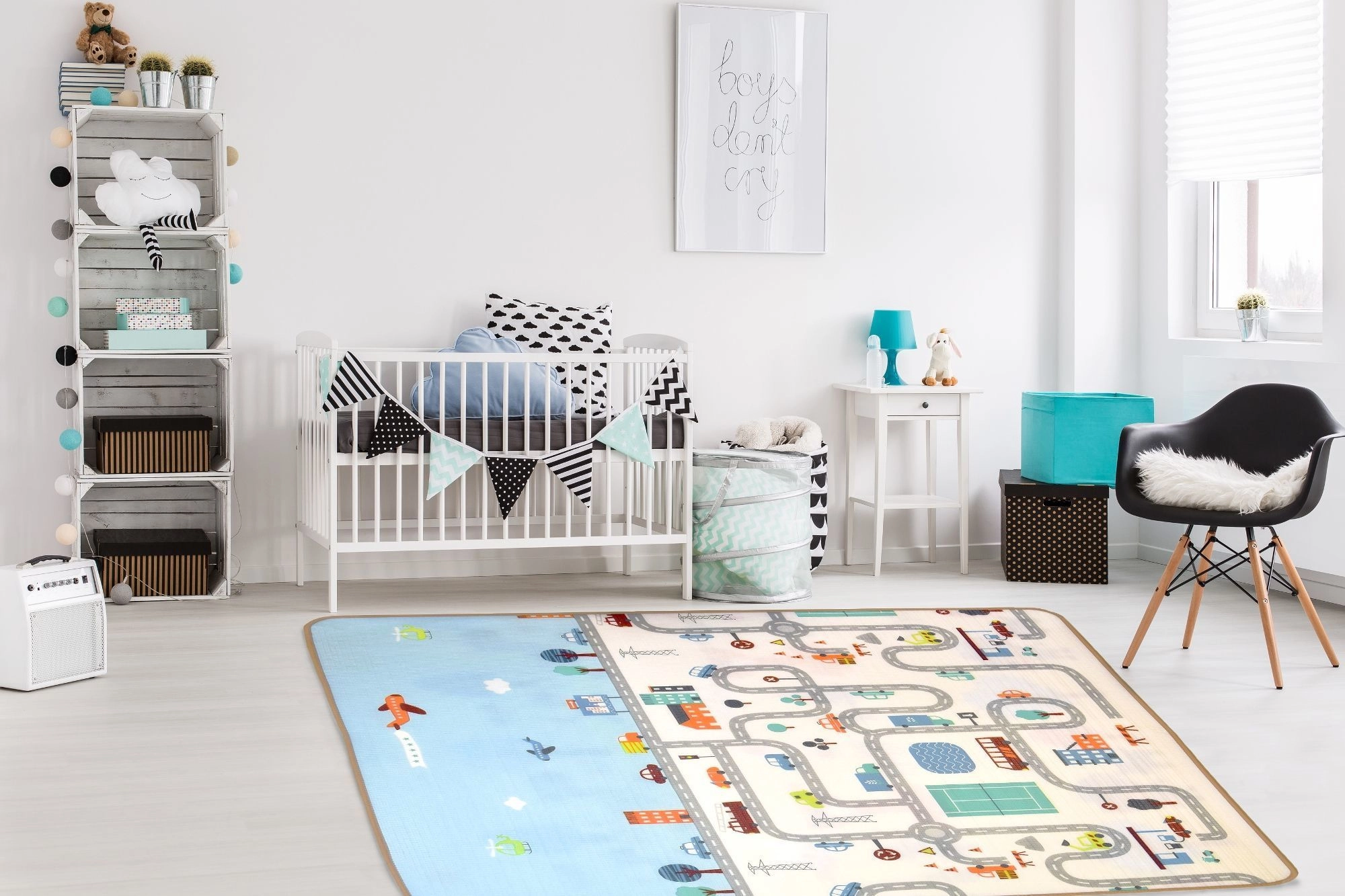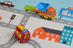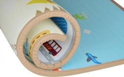 Jedna strana s potiskem města a cest podporuje kreativní jízdu autíčky, druhá s roztomilými zvířátky rozvíjí fantazii a vytváří klidnou atmosféru.