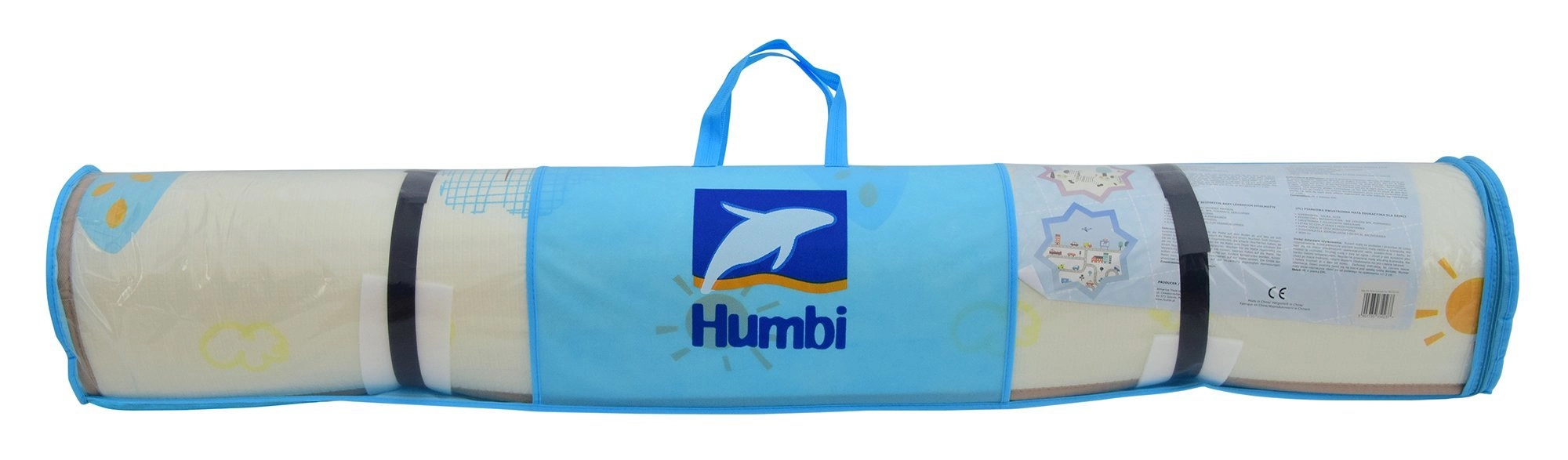 Součástí je lehká transportní taška HUMBI s uchy a zipem. Umožňuje čisté a pohodlné uložení i přenášení podložky doma, na zahradě či na cestách.