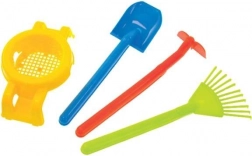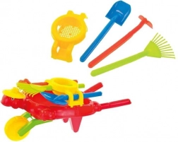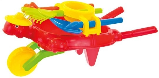 Velké, pohyblivé kolo zajišťuje plynulou a stabilní jízdu na různých površích, zatímco dvojité opěrky umožní kolečko bezpečně odložit. Ergonomické rukojeti jsou přizpůsobené dětským dlaním a podporují jistý úchop. V balení nechybí praktické doplňky: hrábky, lopatka, motyčka a sítko – ideální pro přenášení hlíny, sběr listí nebo prosévání písku.