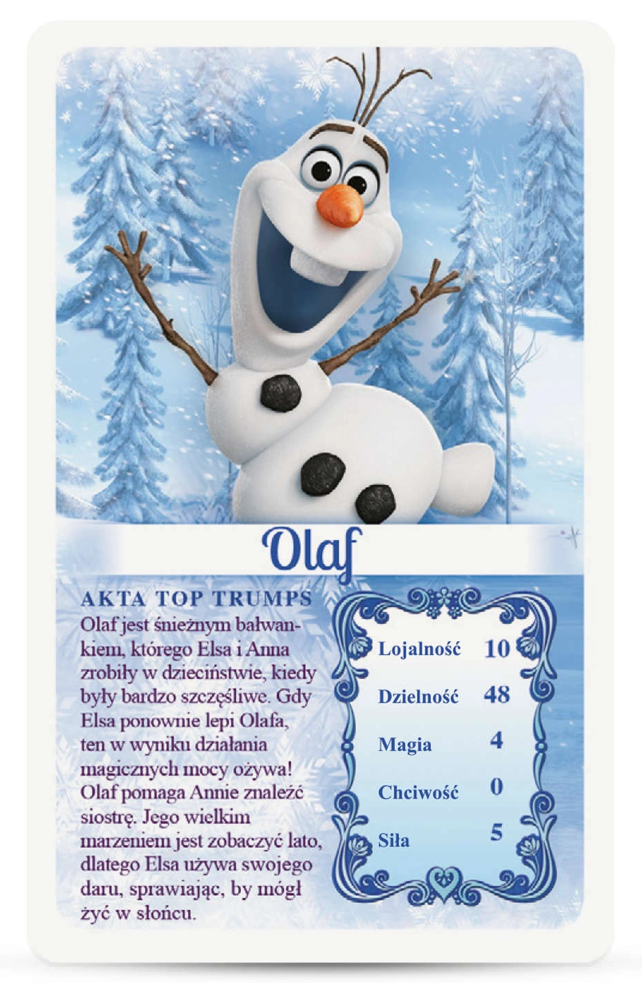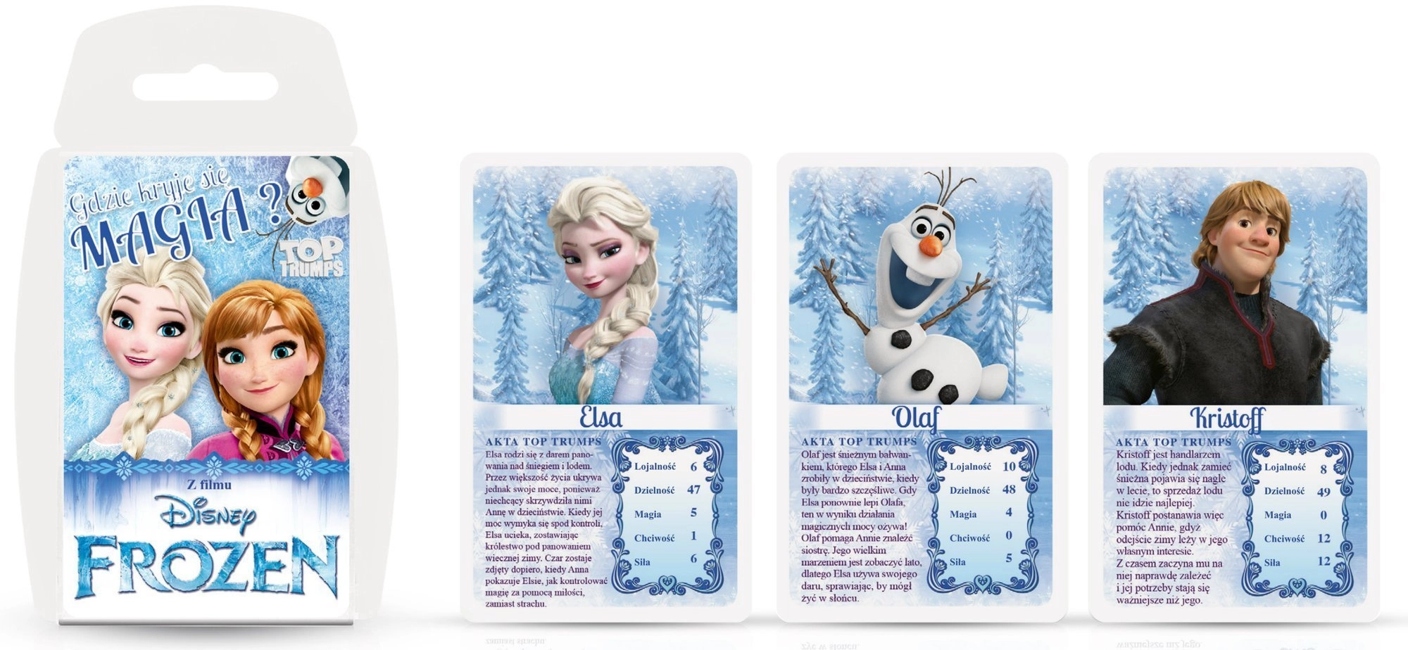 Vstupte do kouzelného světa DISNEY a užijte si rychlou a napínavou zábavu s karetní hrou Top Trumps na motivy Ledového království. Ideální pro fanoušky Elsy, Anny a Olafa a pro rodinné večery. Jednoduchá pravidla, rychlá hra cca 15 minut a zábava pro 2 a více hráčů dělají z této hry skvělou volbu na cesty i domů.