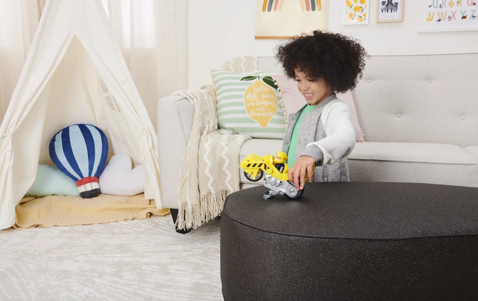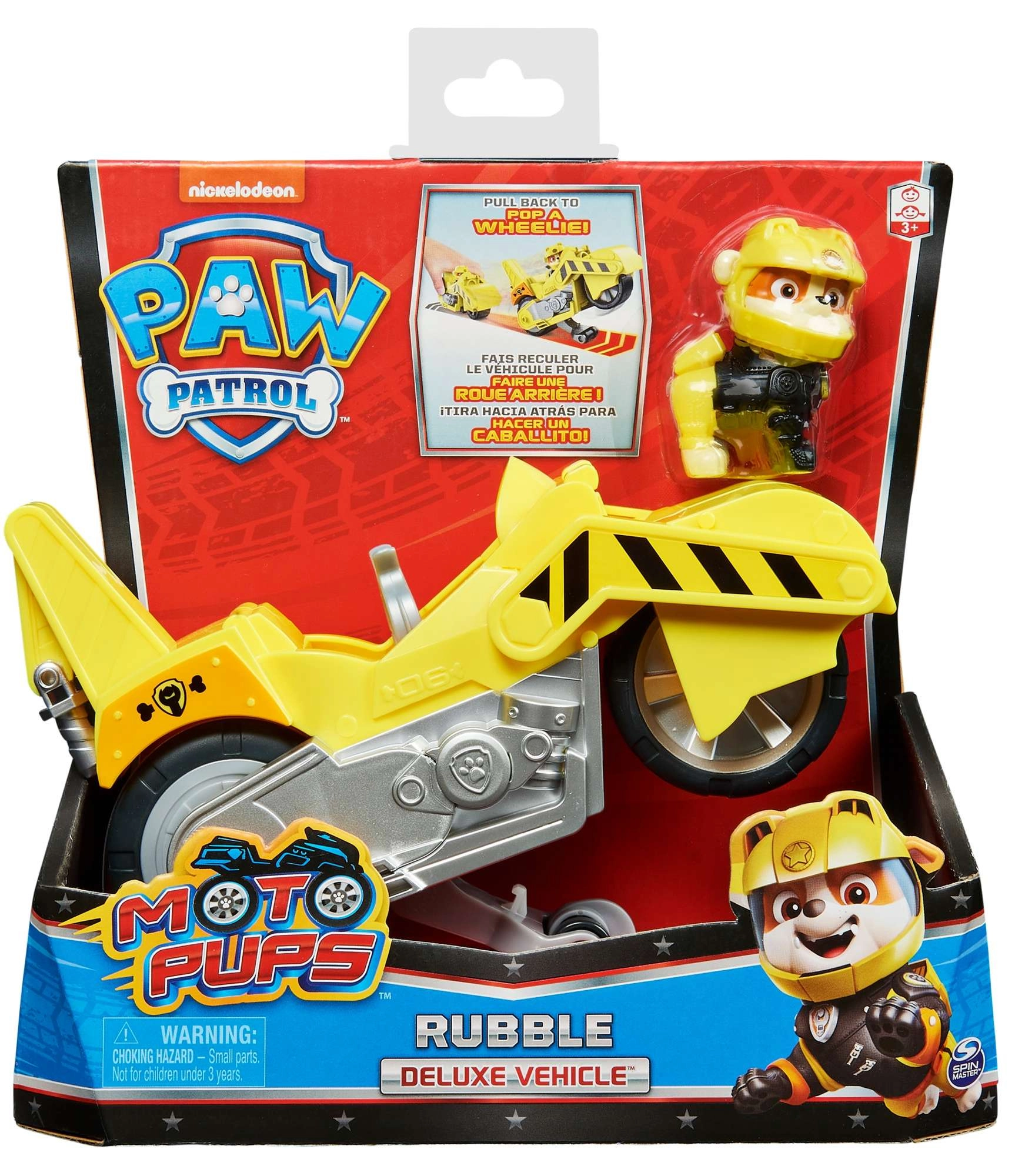 Vyrazte na stavbu i na záchrannou misi s buldokem Rubblem a jeho žlutým kaskadérským motocyklem ze série Moto Pups. Robustní zpracování, výrazné žluté detaily a velká kola zajišťují skvělou stabilitu, zatímco setrvačníkový mechanismus přinese dětem spoustu rychlé zábavy.