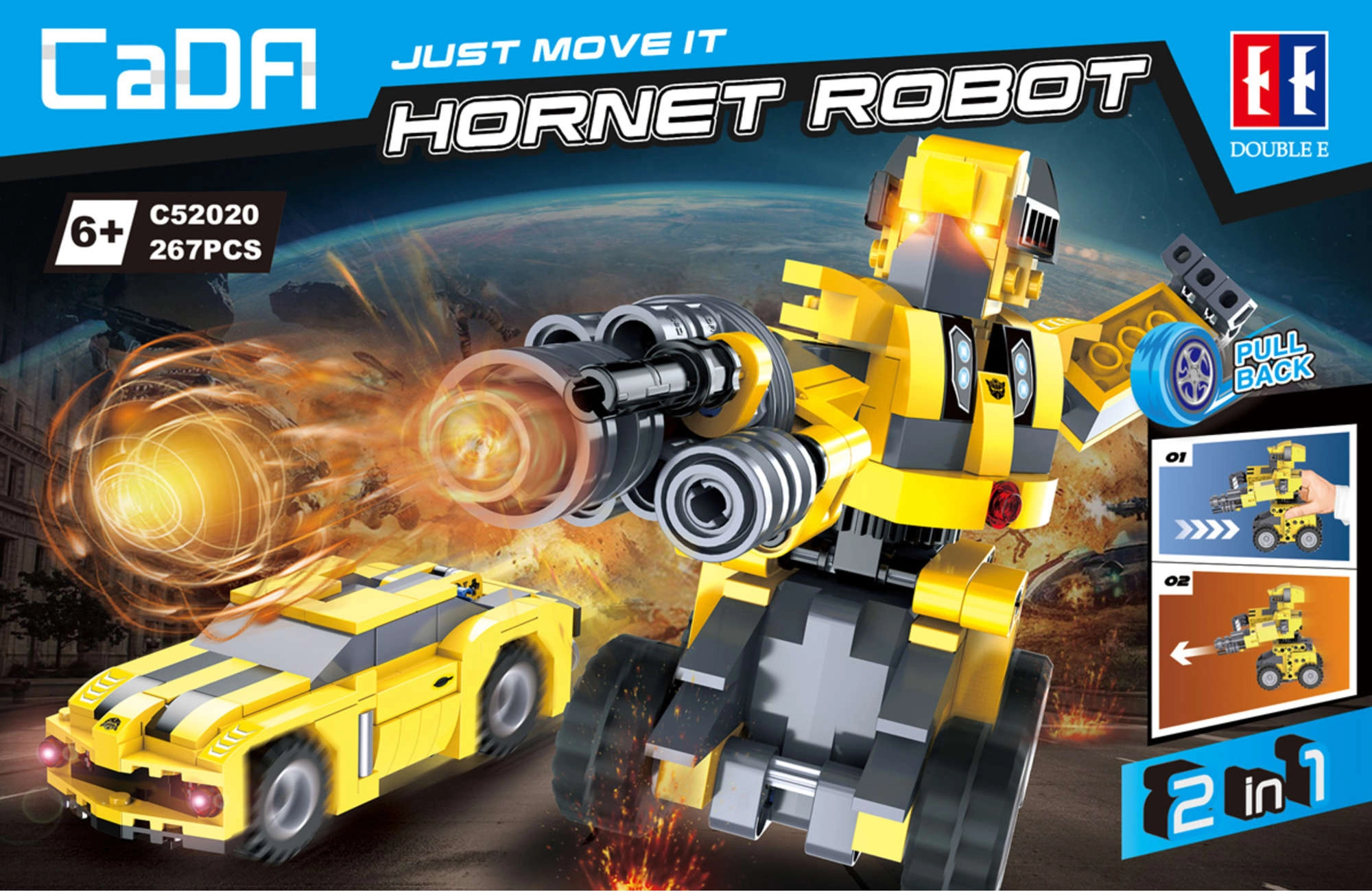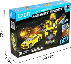 Objevte zábavu 2v1 se stavebnicí CaDA Hornet: z 267 dílků postavíte buď dynamického robota, nebo sportovní auto s natahovacím (pull-back) pohonem. Modely v žluto-šedém provedení mají gumová kola, pohyblivé části a jsou kompatibilní s dalšími stavebnicemi. Skvělá volba pro rozvoj koordinačních dovedností i fantazie.