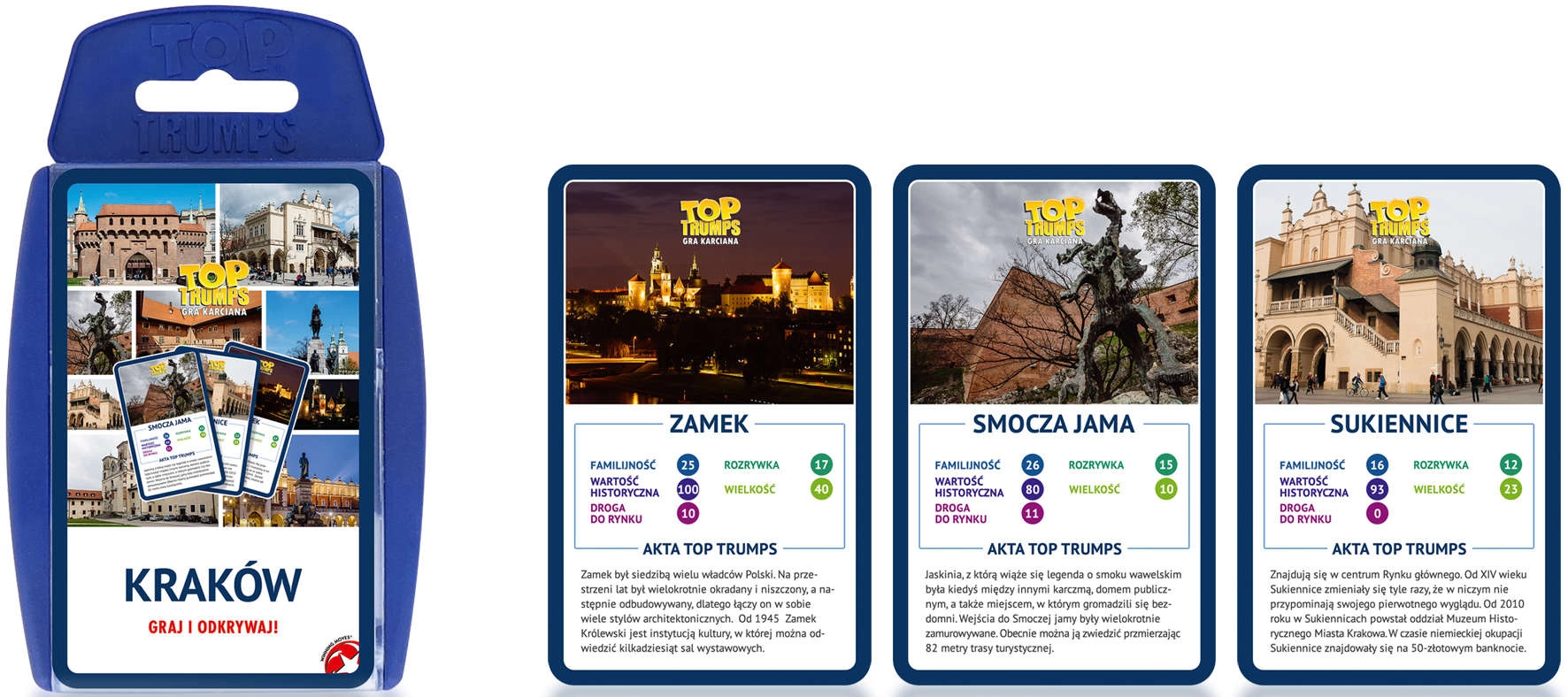 Edice Krakov přináší tematické karty s lokalitami a zajímavostmi, které hře dodávají charakter. Díky praktickému plastovému pouzdru si hru vezmete kamkoli – na výlet, dovolenou i návštěvy.