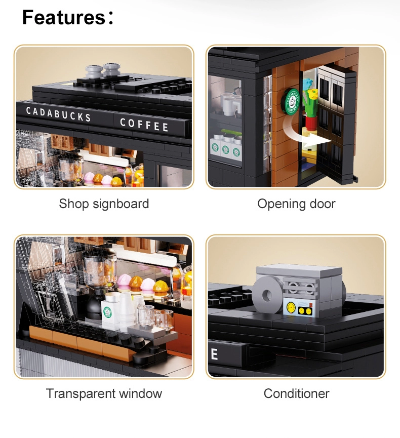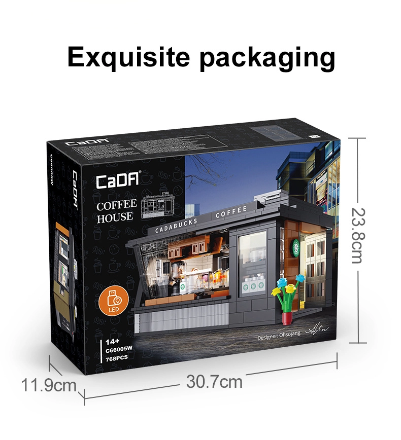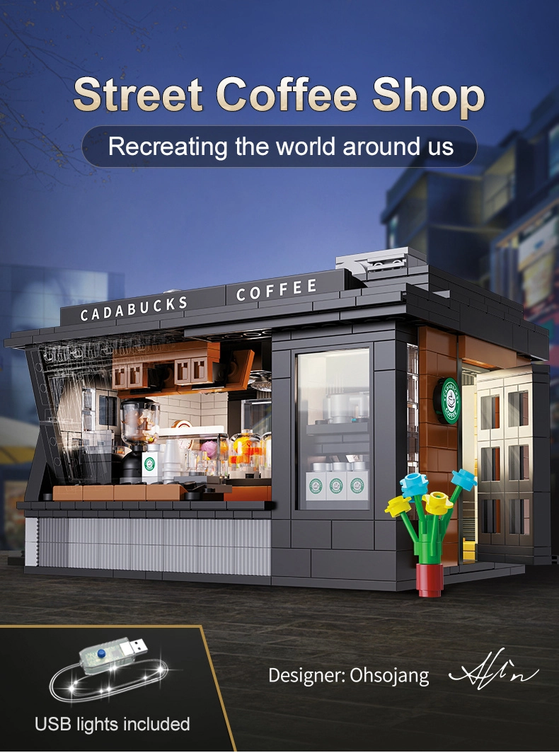 Postavte si vlastní mini kavárnu s modelem Cadabucks Coffee House od značky CaDA. Stavebnice obsahuje 768 dílků, detailní interiér baristy i zákaznické zóny a funkční LED osvětlení pro autentickou atmosféru. Odnímatelný zadní díl a střecha zajišťují snadný přístup dovnitř, nechybí výlohy, cedule, dveře a mnoho realistických doplňků.