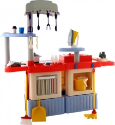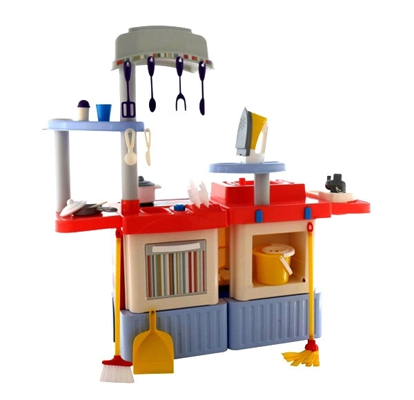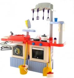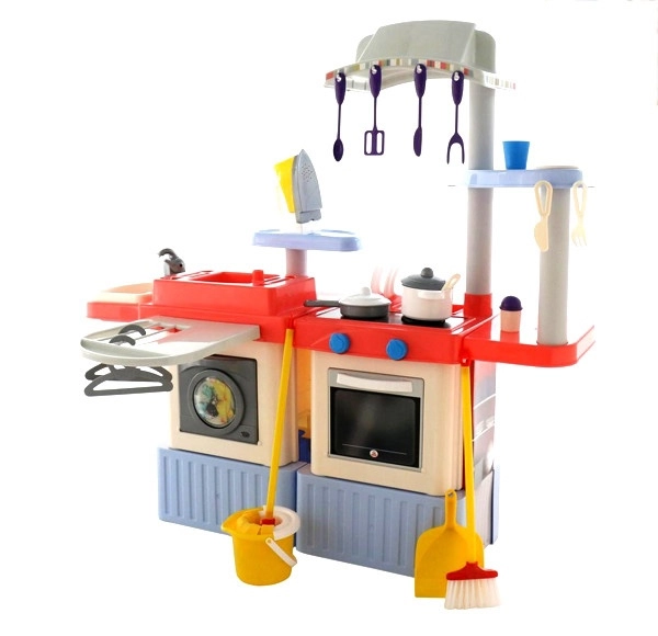 V balení najdete všechny vyobrazené doplňky: nádobí, náčiní a pomůcky pro praní a úklid. Děti mohou ihned začít vařit, prát i žehlit.