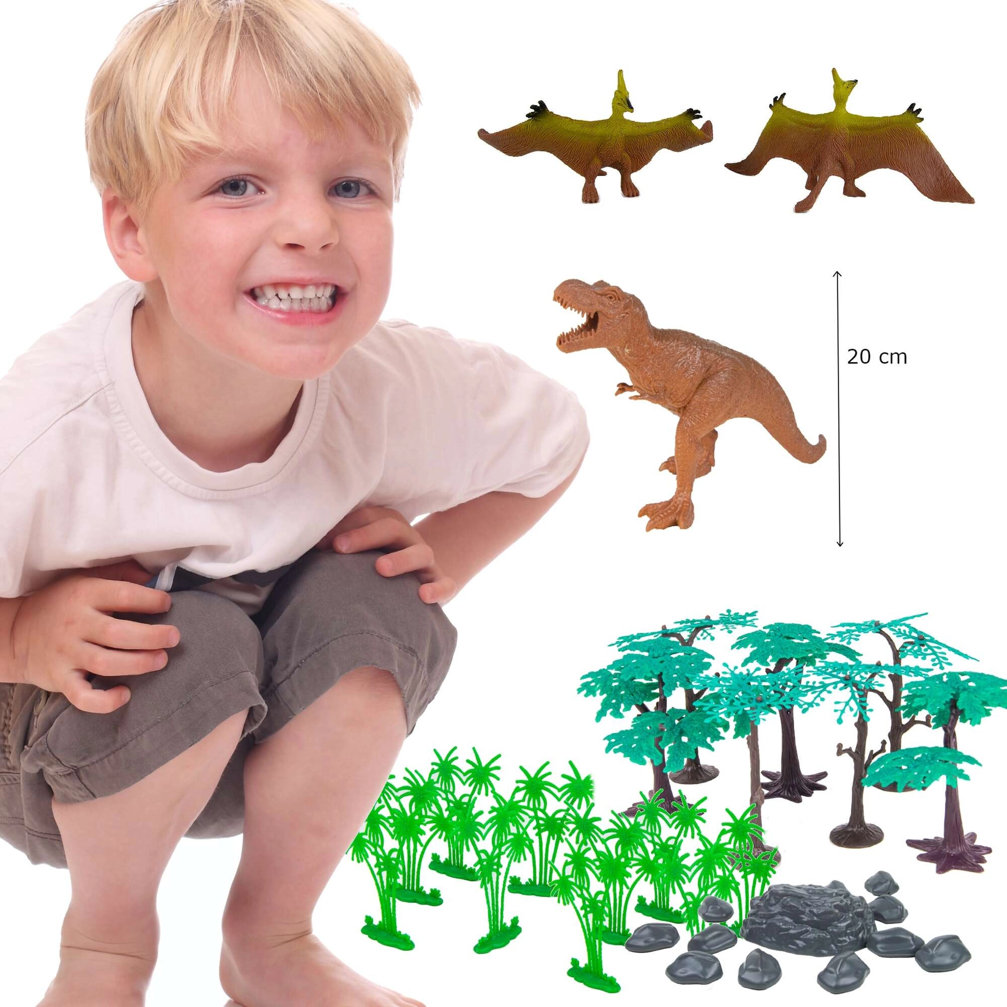 Čtyři velké figurky (včetně T‑Rexe a pterosaura), sedm středních, šestnáct malých a k tomu stromy i skály. Postavte si vlastní pravěkou krajinu a vyprávějte příběhy.
