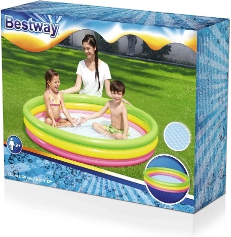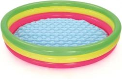 Duhový kruhový bazének z odolného vinylu přináší pohodlí i jistotu při dětských vodních radovánkách. Měkké, nafukovací a texturované dno tlumí došlapy a izoluje od chladu země, takže je skvělý jak na trávník, tak na terasu. Tři samostatně nafukované prstence drží tvar a zvyšují stabilitu konstrukce.