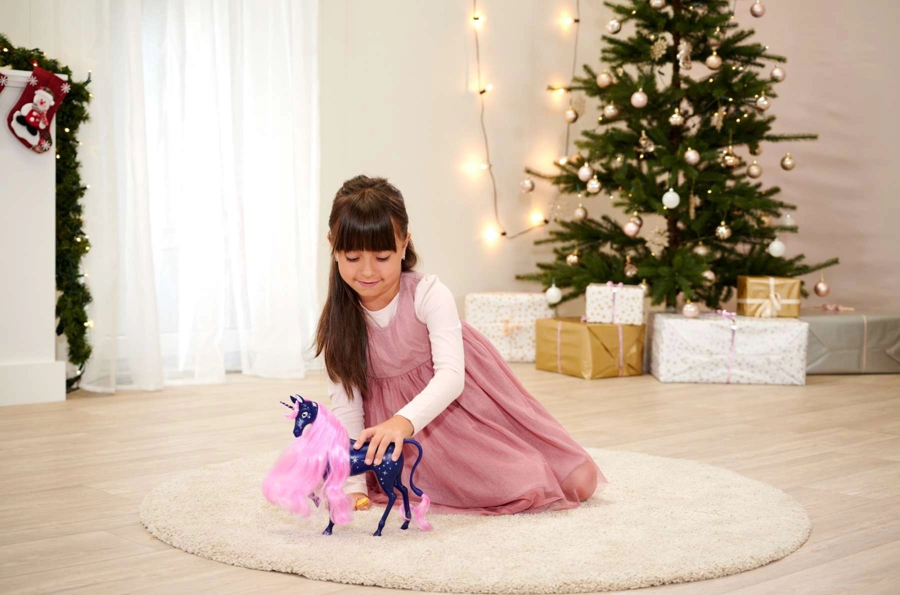 Objevte kouzlo Centopie s nádhernou figurkou hvězdného jednorožce inspirovanou seriálem Mia and Me. Tmavě modré tělo zdobí množství hvězdiček, které se na světle nabíjejí a poté magicky svítí ve tmě – jako noční obloha plná třpytivých hvězd. Dlouhá růžová hříva i ocas přímo vybízejí ke kreativnímu česání.