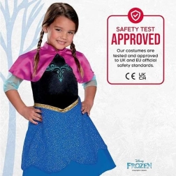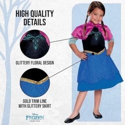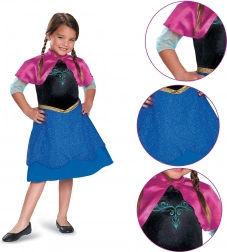 Součástí je šaty v modrých a saténově černých tónech a krátká růžová pláštěnka, díky nimž je vzhled věrný postavě Anny. Kostým je určen pro děti ve věku 5–6 let a padne dětem s výškou 109–123 cm.