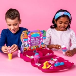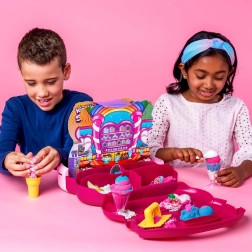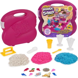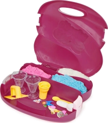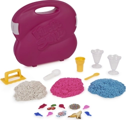 Sada Ice Cream Station v pevném přenosném kufříku přináší 3 barvy písku (celkem 680 g) a řadu nástrojů: kelímky, naběračky, lžičky a formičky pro realistické dezerty. Perfektní na doma i na cesty – vše má své místo a po hraní se snadno uklidí.