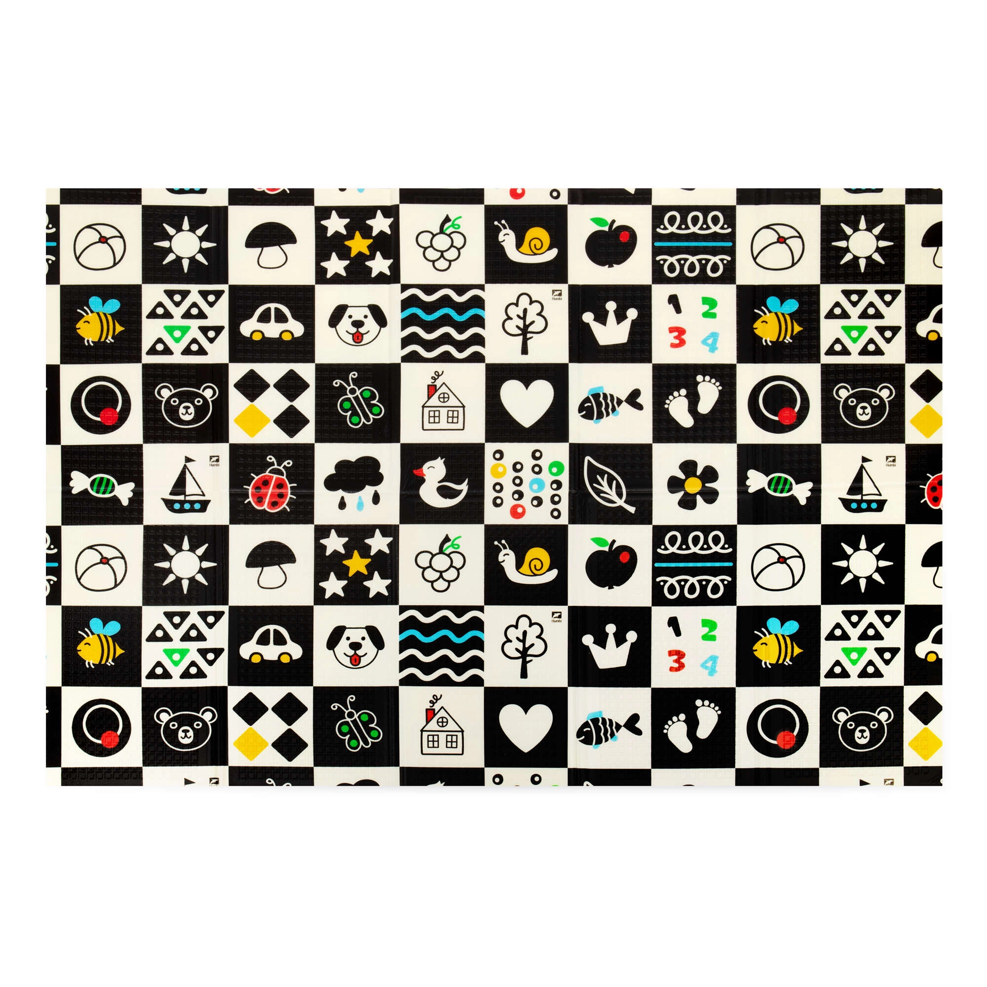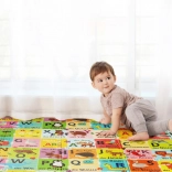 - 2v1 design: barevná strana s abecedou a zvířátky + kontrastní černo-bílá strana s ikonami.