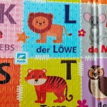 Oboustranná dětská podložka HUMBI z odolné pěny XPE o velikosti 120 × 180 cm nabízí měkké odpružení, protiskluzový povrch a snadné čištění. Jedna strana je barevná s německou abecedou a zvířátky, druhá kontrastní černo-bílá pro vizuální stimulaci miminek. Skvěle izoluje od chladu, je voděodolná a vhodná pro hraní, cvičení i první krůčky.