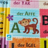 Barevná strana s německou abecedou a roztomilými zvířátky podporuje první seznámení s písmeny, kontrastní černo-bílá strana stimuluje zrak a soustředění.
