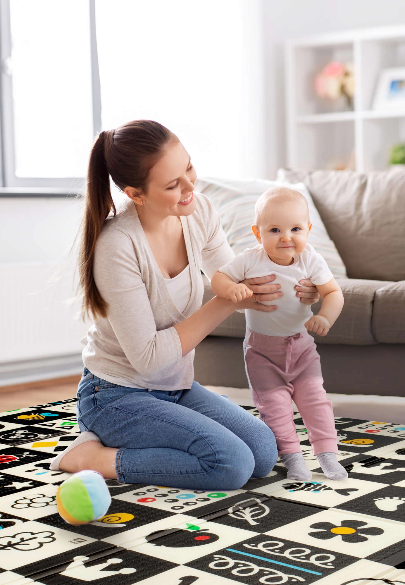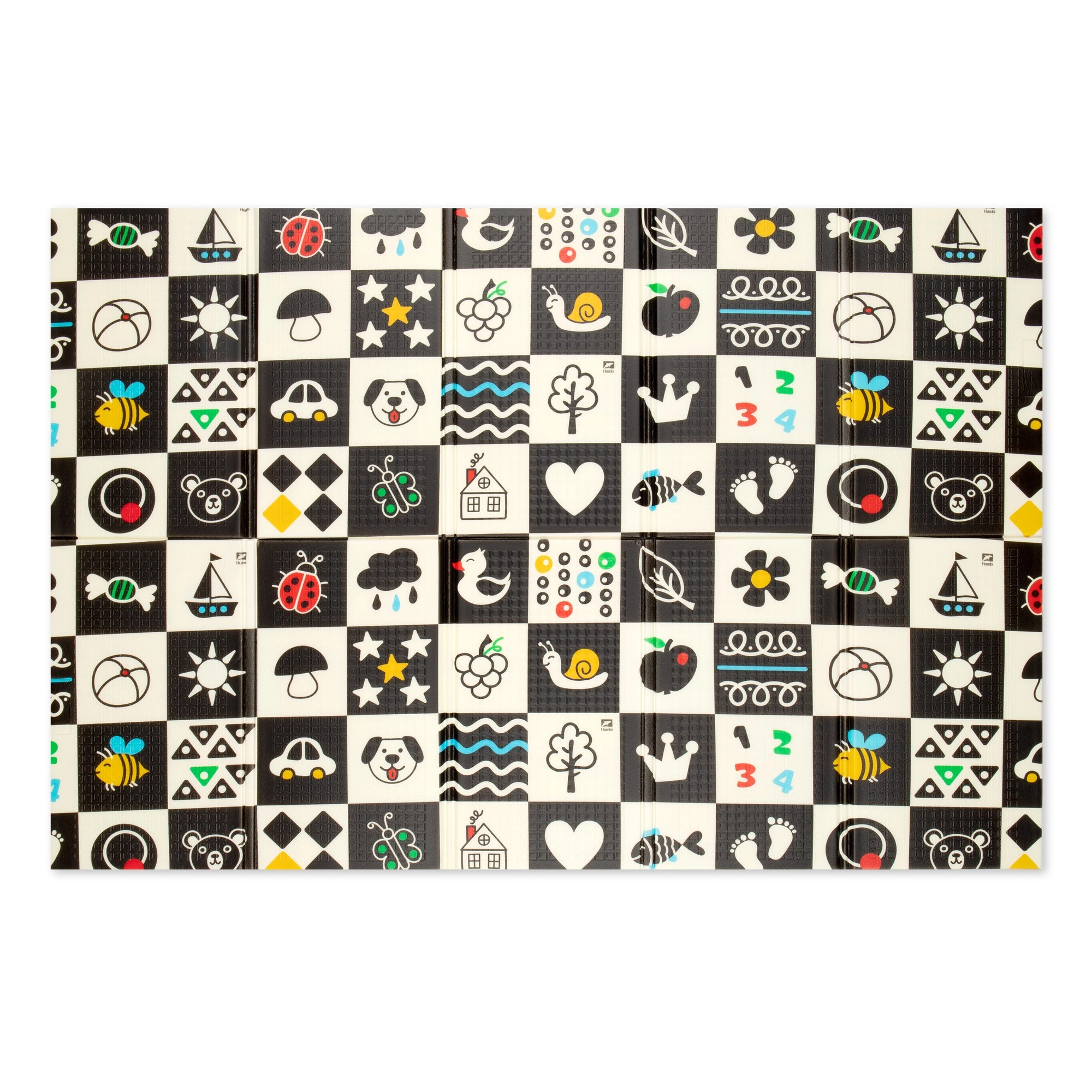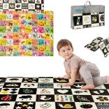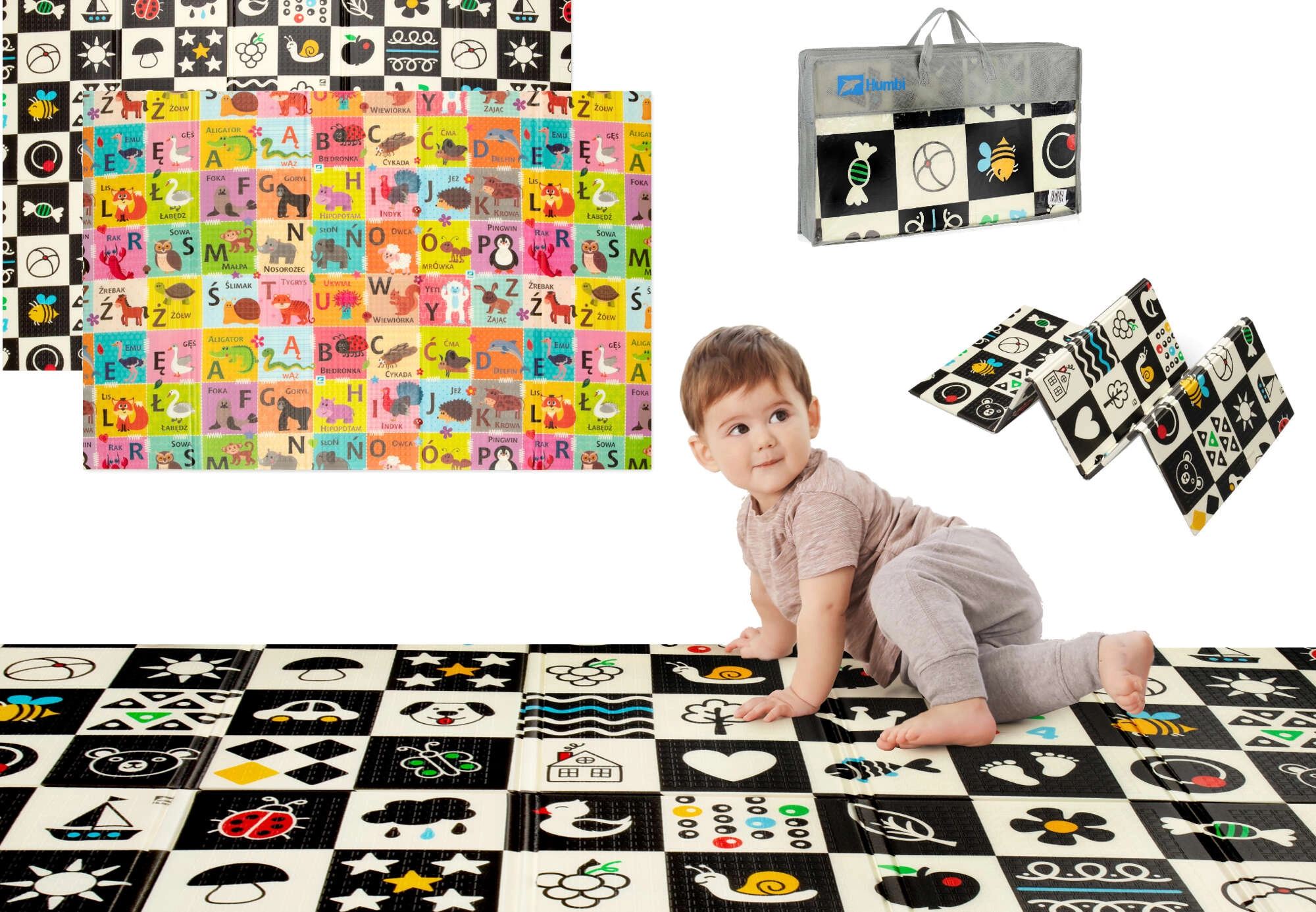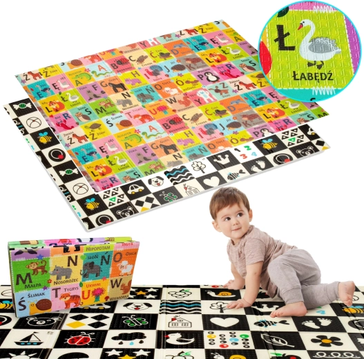 Velká, měkká a skládací podložka z prémiové pěny XPE zajistí miminku bezpečné a pohodlné místo na hraní, pasení koníčků i první krůčky. Je oboustranná s edukativní grafikou (abeceda a kontrastní ikonky), voděodolná, snadno se čistí a díky přiložené transportní tašce ji vezmete do obýváku, dětského pokoje i na zahradu.