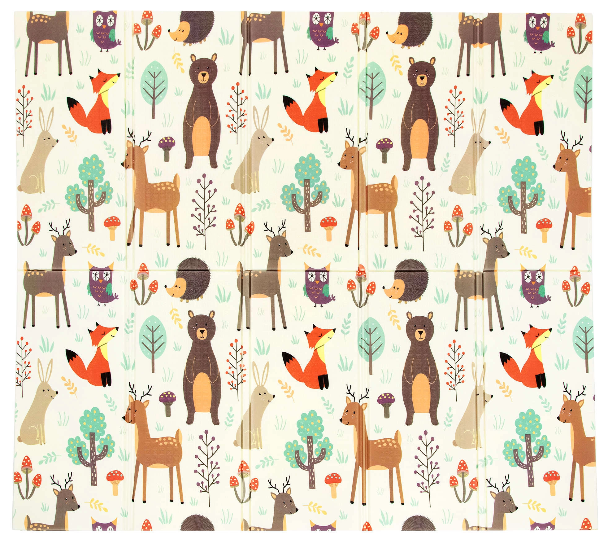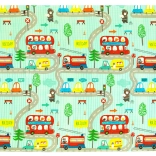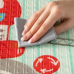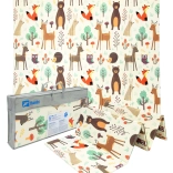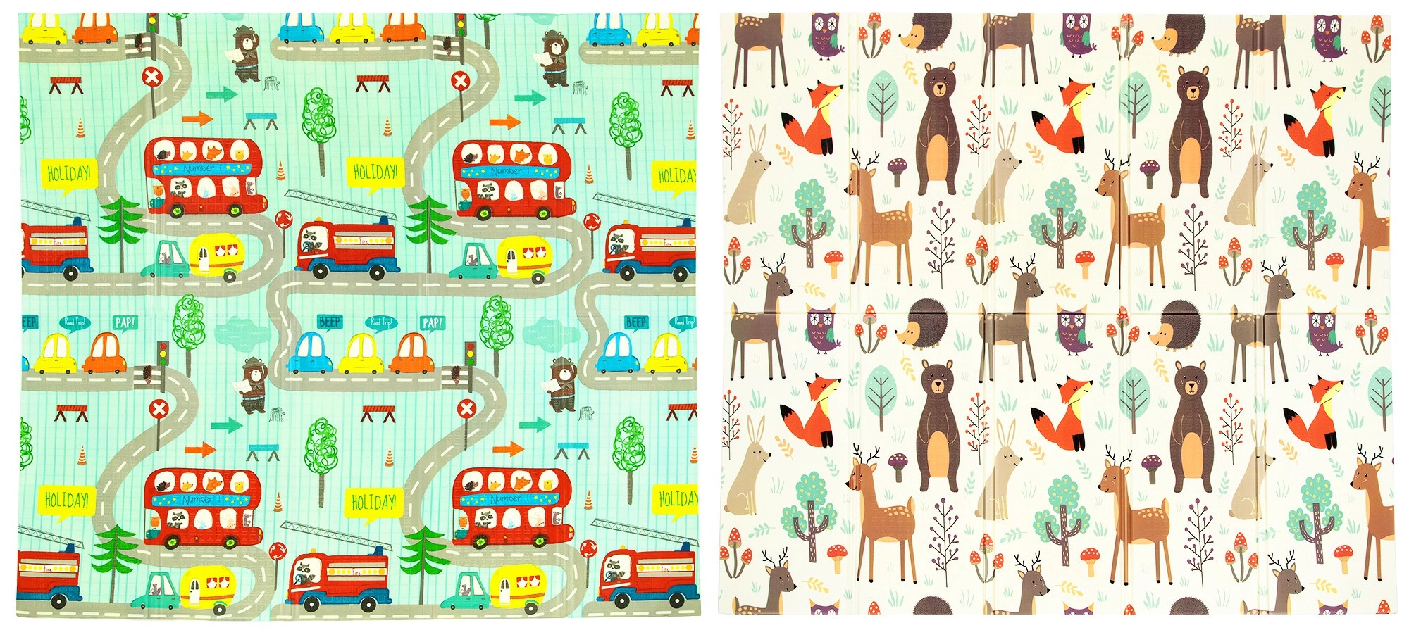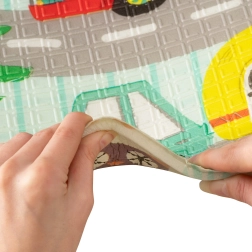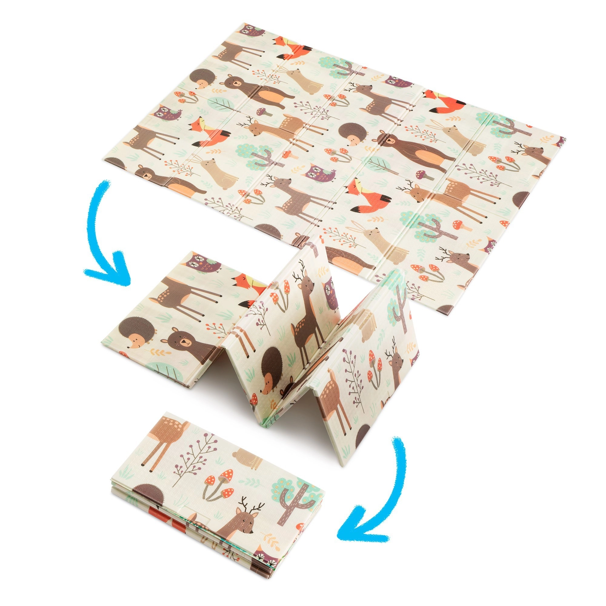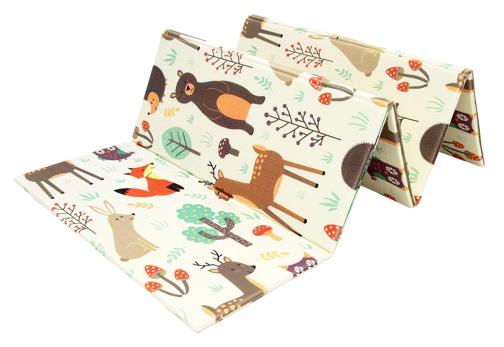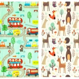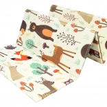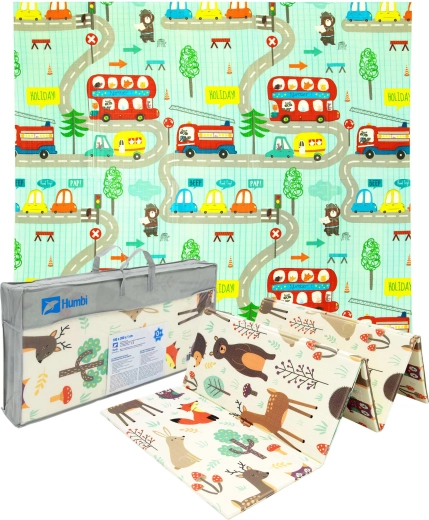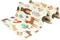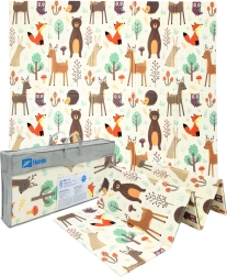 Podložka je oboustranná: jedna strana přináší jemné motivy lesních zvířátek, druhá zábavné barevné uličky. Snadno se skládá do kompaktního rozměru, je lehká a díky tašce na zip s uchy ji vezmete do obýváku, dětského pokoje i na zahradu či piknik. Voděodolný povrch stačí otřít vlhkým hadříkem – hygienické řešení vhodné i pro alergiky.